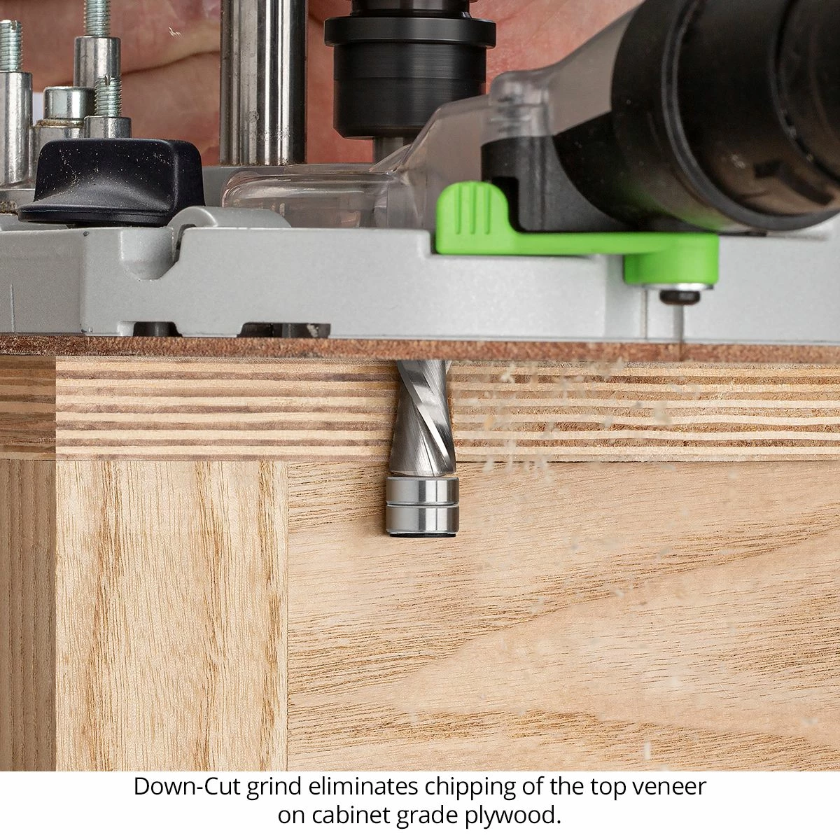 Up-Cut or Down-Cut? Up-Cut bits pull the chips toward the router, cleaning out the cut area quickly. They’re generally the preferred approach, unless you’re working with a type of plywood that tends to chip with an Up-Cut. Down-Cut bits slice downward into the material, eliminating tear-out.