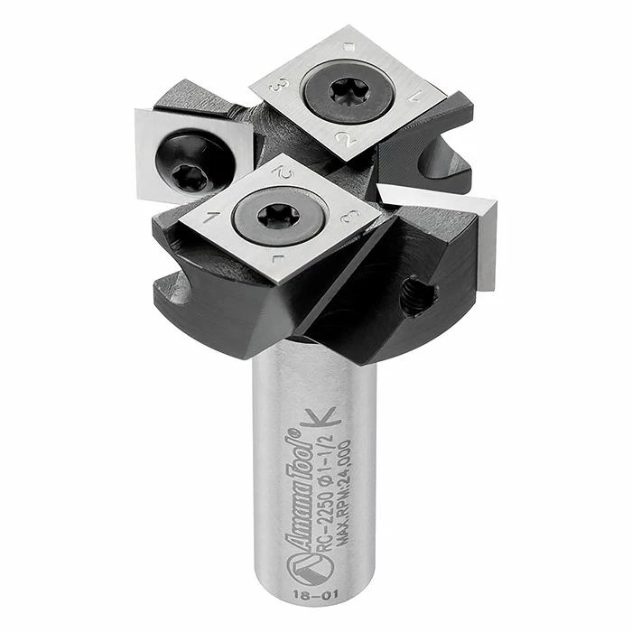 Amana’s insert spoilboard router bit with scorers features a unique 2+2 knife design containing two cutting flutes and two up-shear scorers. In man-made materials you get a smoother finish at the bottom of the cut than traditional two-knife style router bits. In solid wood, you may remove the bottom scoring blades, but in certain grain patterns they tone down tear-out.