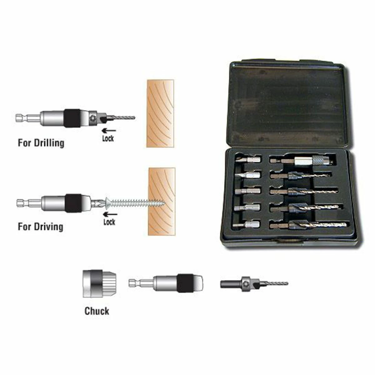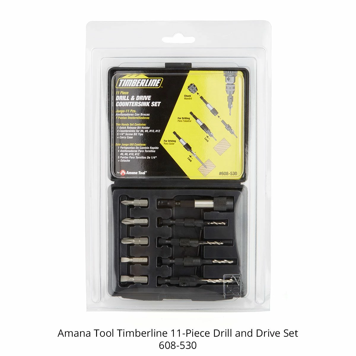 Quickly drill and drive with the Timberline 11-Piece Drill and Drive Countersink Set from Amana Tool. This set includes 4 tool-steel countersinks designed for No. 6, 8, 10, 12 screws and 3/32″, 7/64″, 1/8″ and 9/64″ drill bits, all with a 1/4” hex shank design for quick release. Also included is (1) Quick Release Bit Holder, (3) Phillips screw bit tips, (2) Slotted screw tips, and (1) Quick Release Chuck.