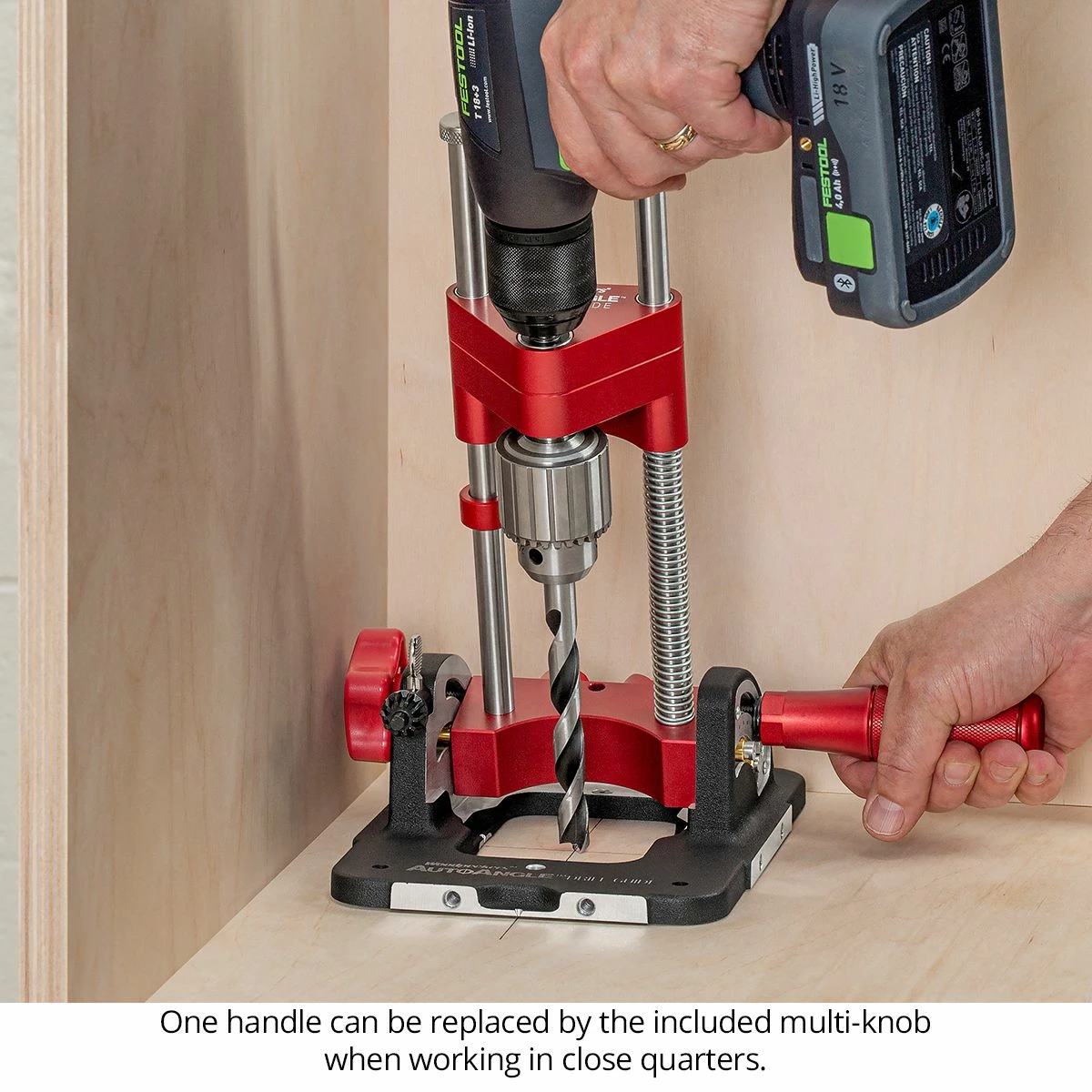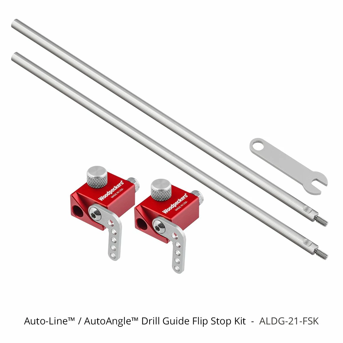 That feature alone puts the AutoAngle in a class of its own, but we didn’t stop there. We built in a versatile fence and stop system that makes it a snap to position the AutoAngle at fixed distances from a square corner. The guide rods are extendable and work with both the fence and the flip stops. You can add extra flip stops to drill a series of holes all the same distance from the edge of the material.