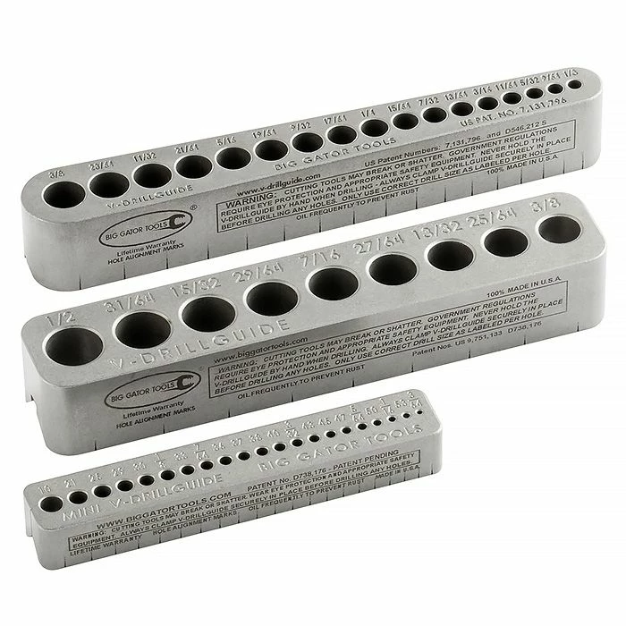 The 3-piece Set includes all three imperial versions: Set includes: one Standard V-DrillGuide® -(3/8-1/2″), one Standard V-DrillGuide® -(1/8-3/8″), and one MINI V-DrillGuide®.