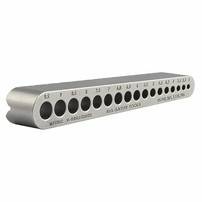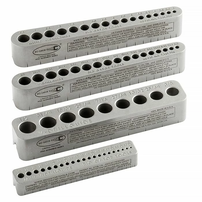 The 4-piece Set includes all four sizes: Set includes: one Standard V-DrillGuide® -(3/8-1/2″), one Standard V-DrillGuide® -(1/8-3/8″), one MINI V-DrillGuide®, and one Metric V-DrillGuide® (3-9.5mm)