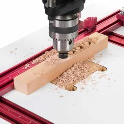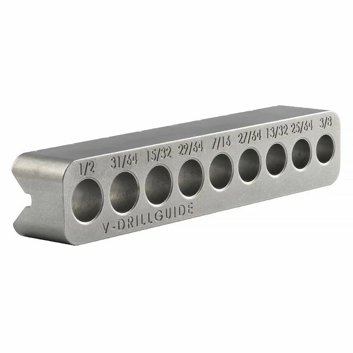 Drill guide is sized for drill bit sizes: 3/8 to 1/2″. 9 drill sizes. 1/64″ increments. 9 drill sizes include: 3/8, 25/64, 13/32, 27/64, 7/16, 29/64, 15/32, 31/64, 1/2″.