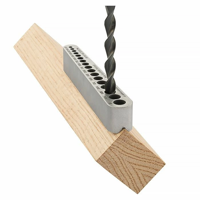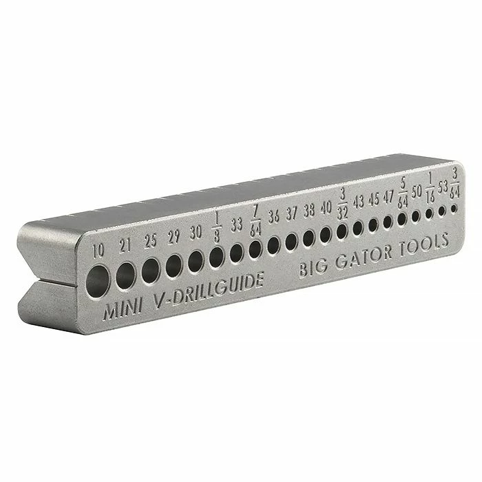 Drill guide has 21 holes: #10, 21, 25, 29, 30, 1/8″, 33, 7/64″, 36, 37, 38, 40, 3/32″, 43, 45, 47, 5/64, 50, 1/16″, 53, 3/64″.