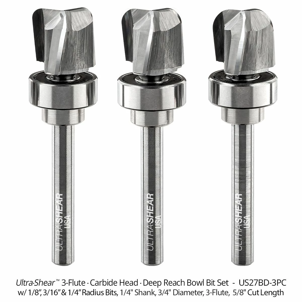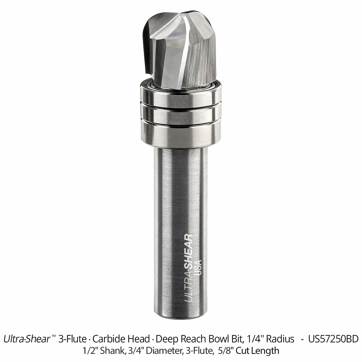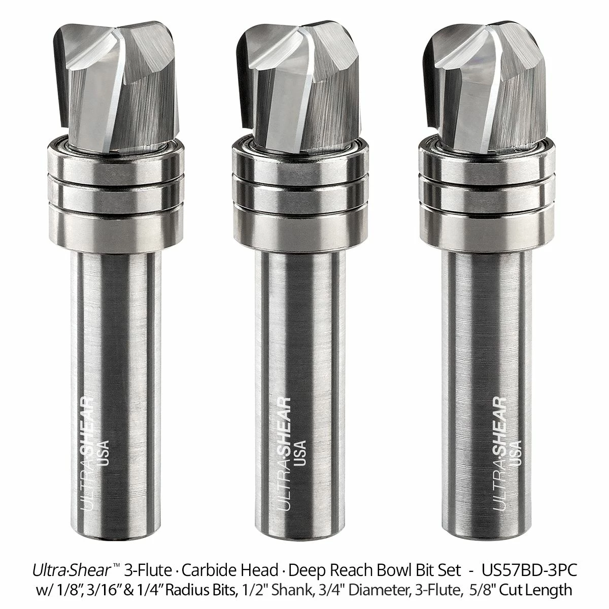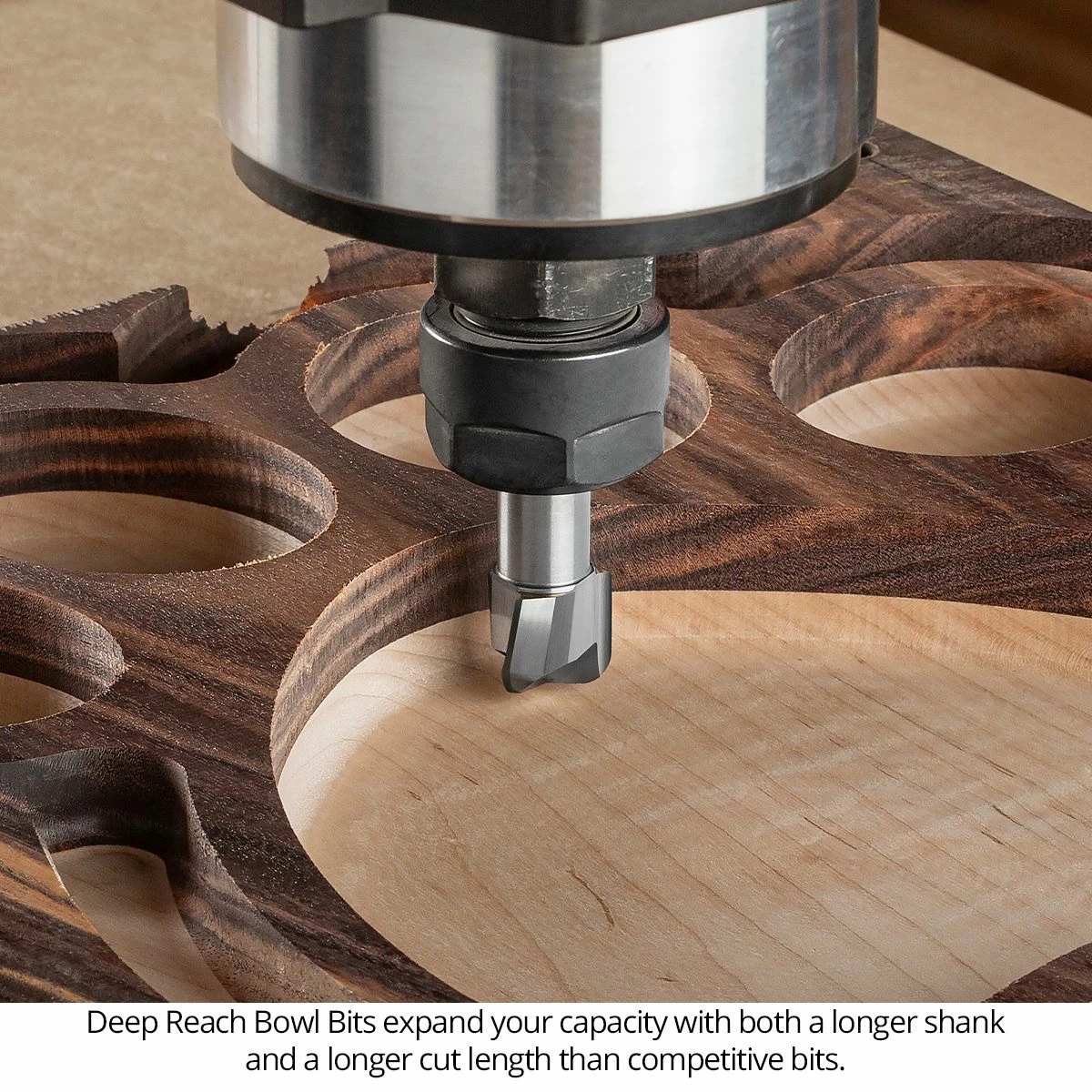 These bits were actually developed in response to a customer request. It seems most of the bowl bits on the market are too short for most home shop CNC machines to be able to cut a reasonably deep recess. So, we gave these extra shank length and made them in both 1/2″ and 1/4″ shank so everyone with any router can get in the game.