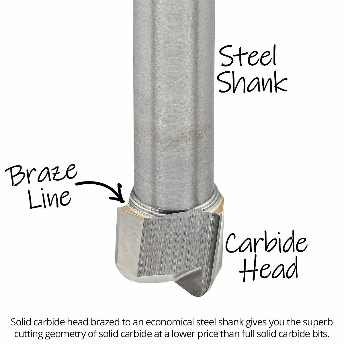 Ultra-Shear borrowed a technique from metal-cutting tool companies to merge solid carbide spiral cutting efficiency with steel shank economy. Our “Carbide Head” bits have a solid carbide blank brazed to a steel shank. After the head is brazed on, the 3-flute slow-spiral cutting pattern is ground to shape, just like our solid carbide spirals. But we don’t have to tie up the machines with turning down the shank, and less machine time means lower prices for you. The result is spiral cutting performance at prices that compete with carbide tipped bits.