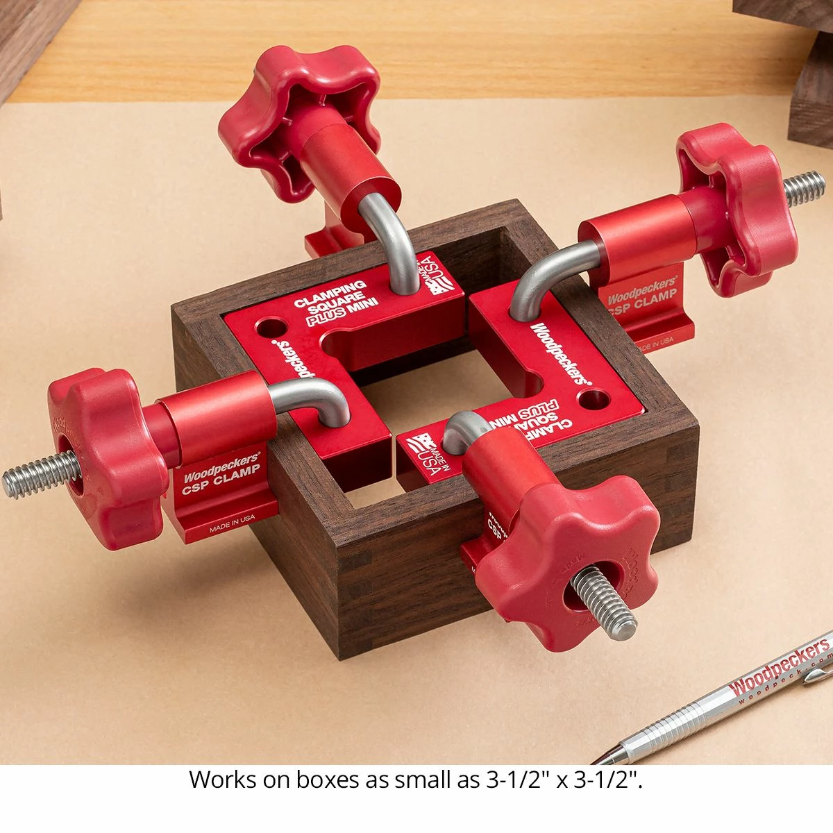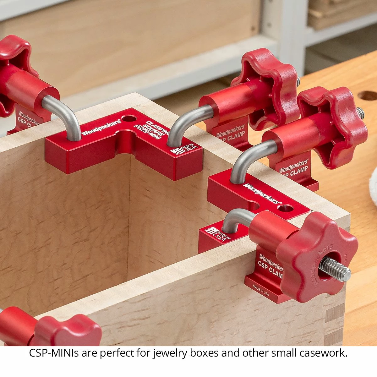 Don’t get the idea CSP-MINIs are just for little boxes. Furniture and cabinets often have drawer and shelf openings between 3 and 6 inches. The CSP-MINIs are just perfect for squaring up those assemblies, too. CSP-MINIs have precisely milled 3/8″ holes in each leg. Our CSP Clamps drop in the holes to make clamping quick and efficient. But, if you already have a collection of “F” or “C” clamps, the CSP-MINIs work with those, as well.