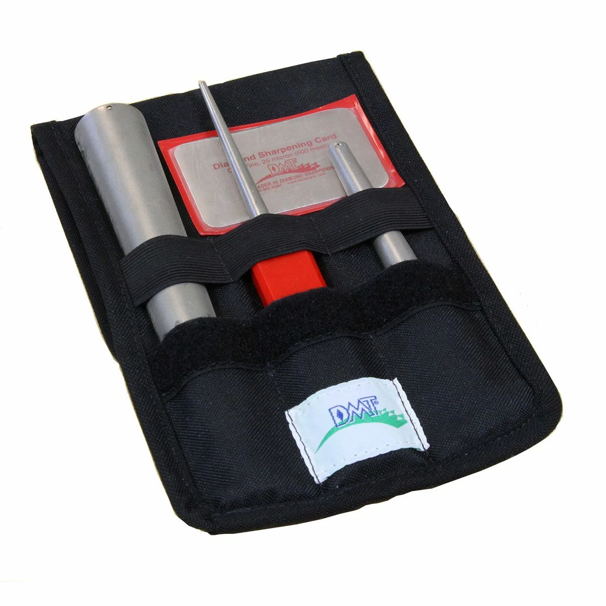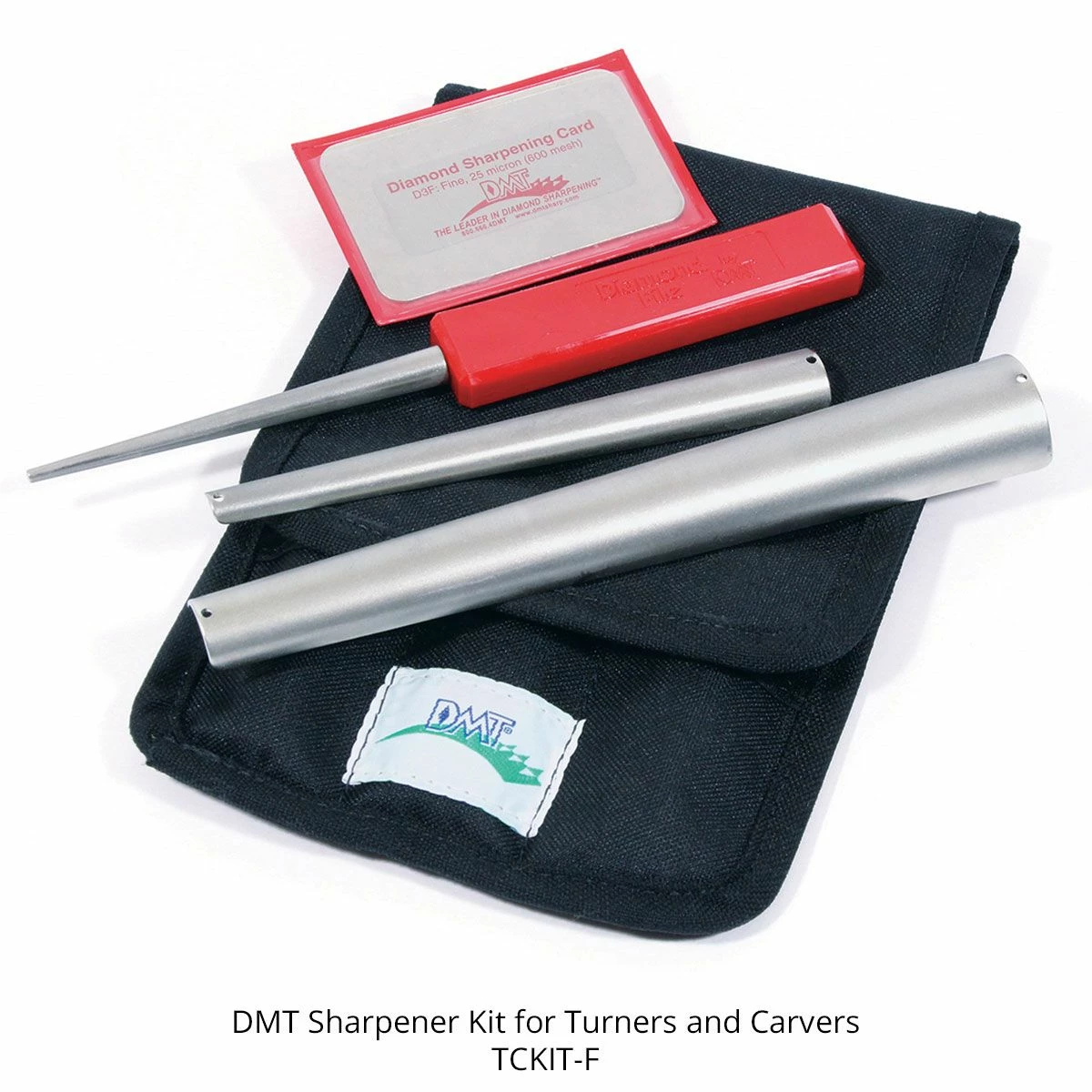 DMT’s Sharpener Kit for Turners and Carvers is perfect for keeping your curved and small edges as sharp as they can be. The kit includes 3 honing cones and an included DMT Credit Card Sharpener. The tapered diamond slip stones are excellent for working gouges, wood turning, tool and die work, dental tools, and more. Additionally, the credit card sharpener is great for small pointed tools and straight edges. Complete with a handy, durable folding storage pouch that holds 3 diamond cones and 1 credit card diamond stone, the carry case can be hung by a work area, stored in a drawer, or placed on a bench for easy sharpening tool access. All of the included sharpeners are equipped with fine diamond (25 micron / 600 mesh) for honing a razor-sharp edge. Thanks to the micronized monocrystalline diamond surface on each sharpener as well, you can sharpen edges much faster and easier than conventional stones can. No messy oils are needed either, allowing you to use any item in the kit dry or with water. With each item complete with a durable construction that will provide years of consistent performance and reliable service, professionals rely on the superior quality and versatility of DMT® products for proper tool maintenance. Made in the USA.