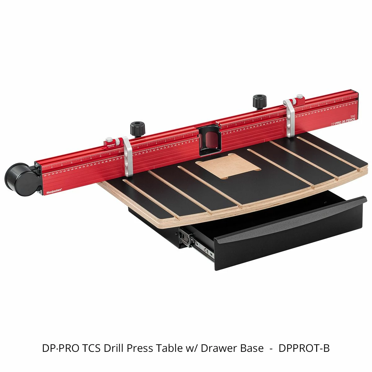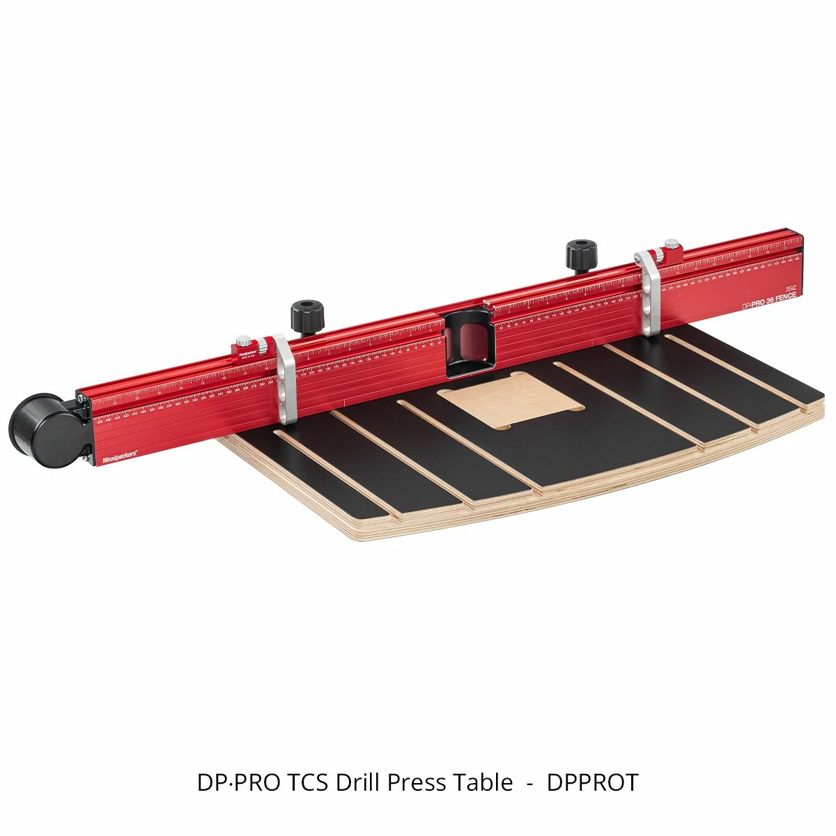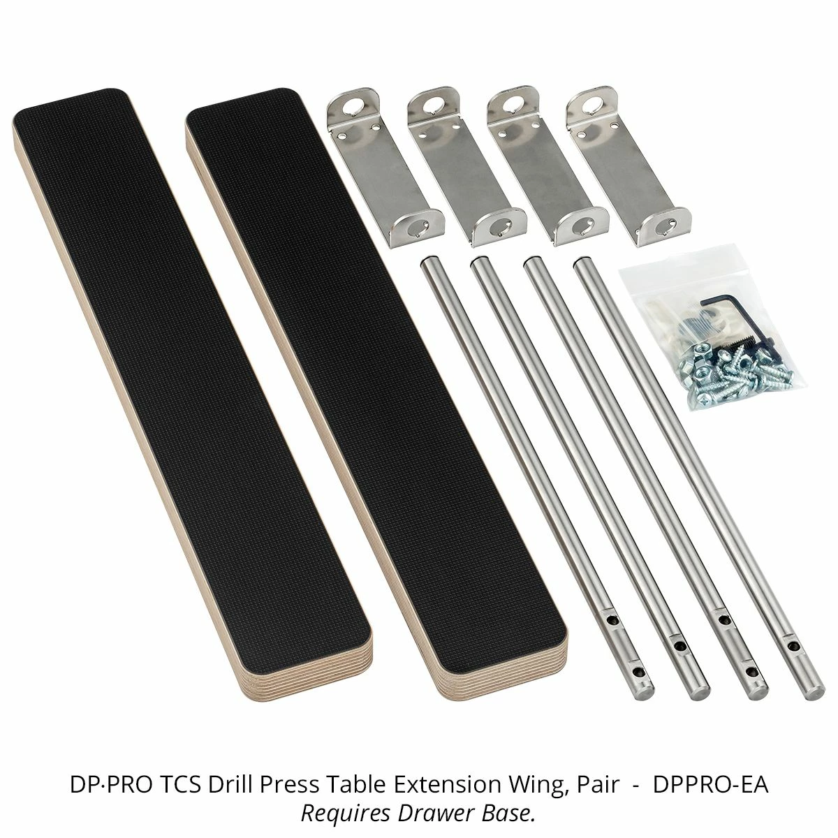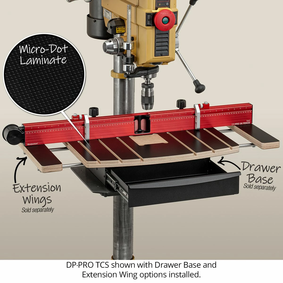 However, if you have a floor model drill press and want the extra storage space the DP-PRO Drawer Base offers, the TCS can mount to the Drawer Base, too, just like the original DP-PRO tables. Similarly, the original DP-PRO tables include extension wings. ON the DP-PRO TCS the wings are optional (requires Drawer Base). The TCS table measures 23-3/4″ wide. Adding the extension wings takes that out to 29-3/4″ when they’re tucked in. When they’re pulled out you have a full 36″ of support for longer projects.