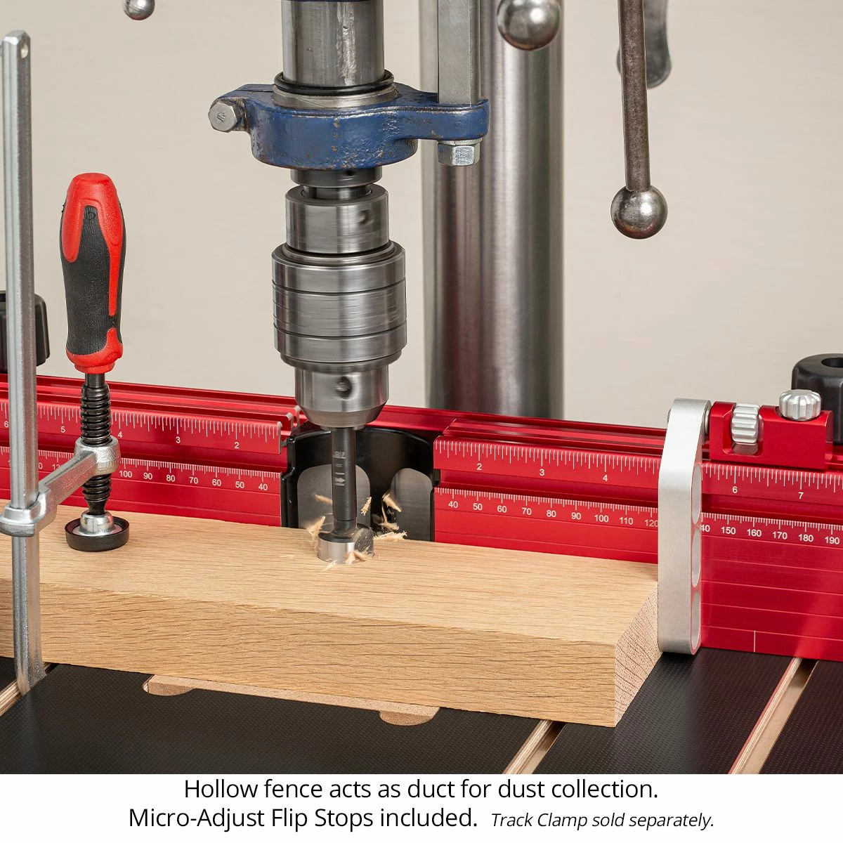 Most customers’ favorite feature of the DP-PRO system is the vacuum fence. Just connect a shop vacuum or dust collector to the fence and the vast majority of the chips and dust are whisked away instantly. The dust port attaches to either end of the fence, whichever is more convenient for you. The fence also features a pair of micro-adjustable flip stops, greatly simplifying repetitive tasks. The fence is engraved with both inch and metric scales, reading away from the center of the fence.