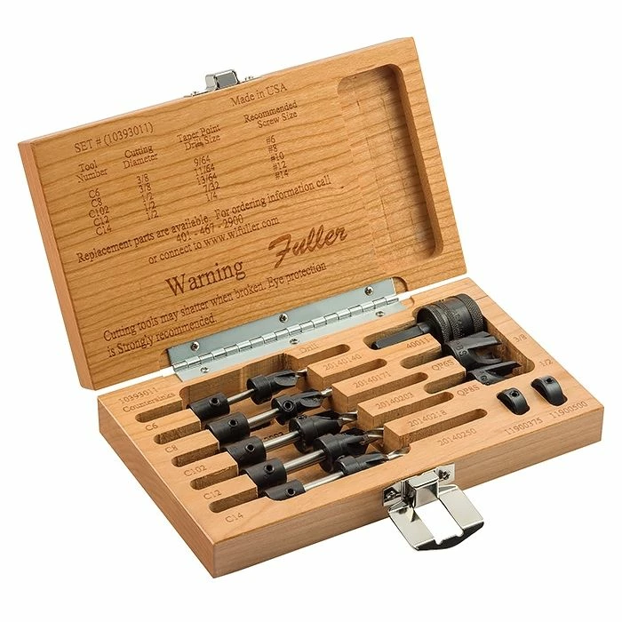 This set is designed to be used with wood screw sizes #6, #8, #10, #12, and #14. Includes quick change chuck, countersinks, counterbores, tapered drills, stop collars and plug cutters (3/8” and ½”).