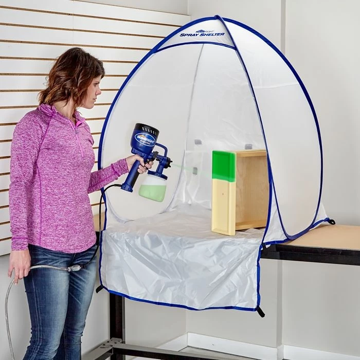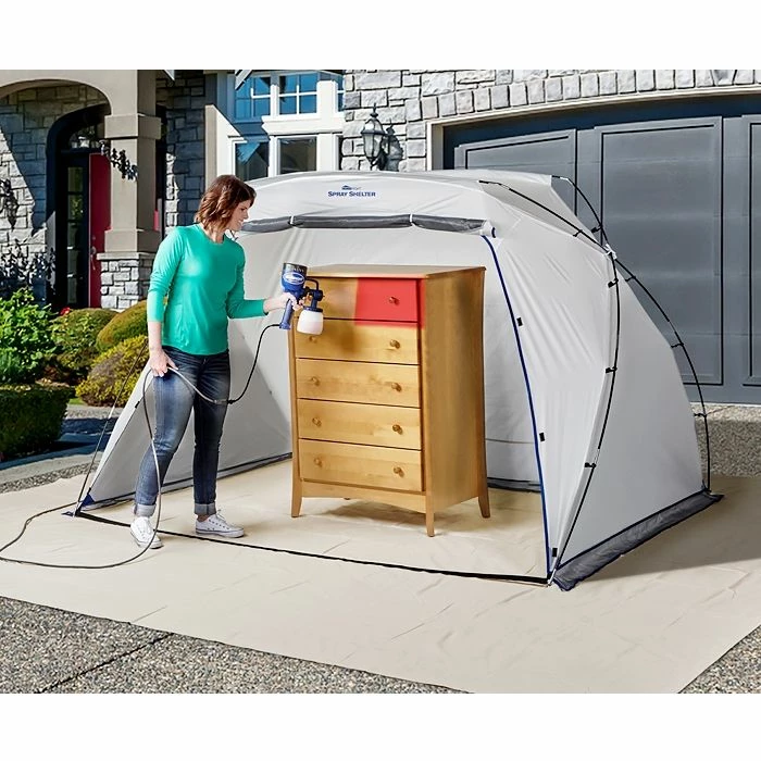 The Large Spray Shelter is great for spraying medium to large sized furniture pieces like small cabinets, larger jewelry boxes, tables and chairs with spray cans or paint sprayers. Recommended drop cloth size for the Large Spray Shelter is 12 feet by 15 feet.