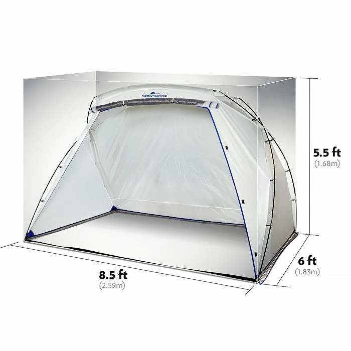 LARGE SPRAY SHELTER SPECS – Set up size: Depth – 72” at bottom, 30” at top. Width — 102” at bottom, 92” at top. Height – 66.5”. Storage size – Depth -29.1”, Width-4.3”, Height-4.3”. Includes Shelter, Storage Bag, 2 poles and 5 stakes.