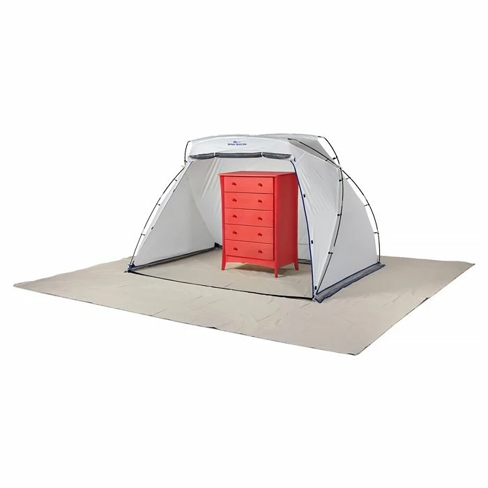 This temporary structure can be used in a yard, garage or shed. Drop cloth in photos not included.