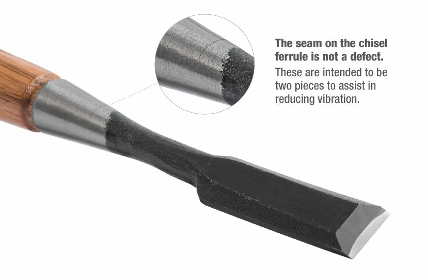 All Japanese chisels that are meant to be struck by a hammer or mallet have a hoop on the end to protect the handle. This hoop is loose in shipping and is intended to be permanently attached by the user. It is a very simple task, but as a benefit gives the user a real understanding of the chisel. These chisels are tang chisels and a ferrule covers the area where the tang and handle meet. Once this is attached the ferrule and chisel are ground. That is why you will see a shinny area above the chisel. Please note that you will see the seam where the chisel and ferrule meet. This is not a defect, but purposely made this way to reduce vibration when hitting the chisel with a hammer.