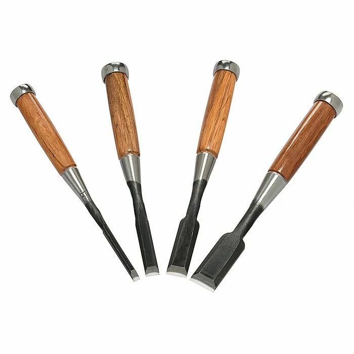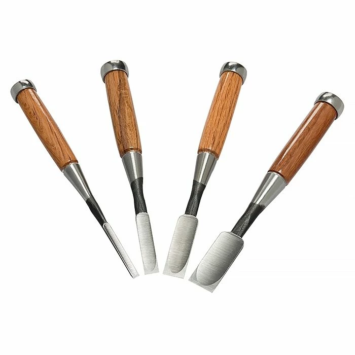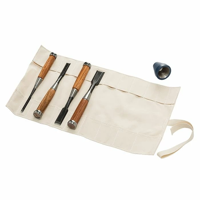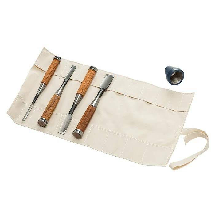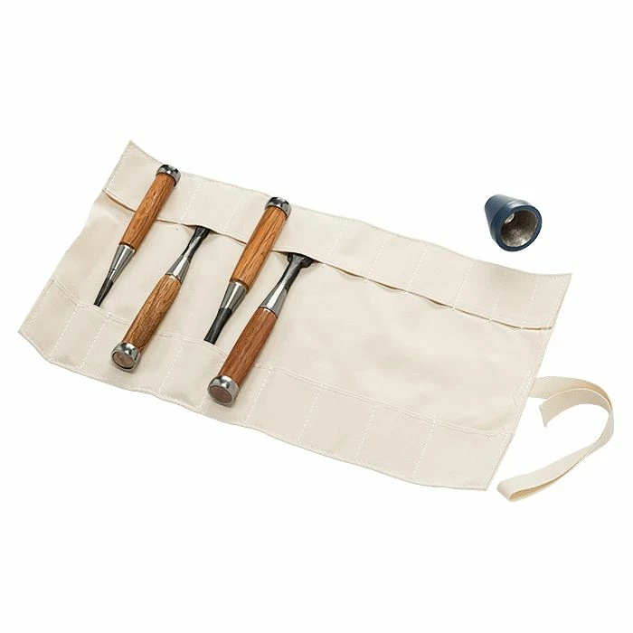 The 4-piece set combines the most popular sizes. 6mm (1/4”), 12mm (1/2”), 18mm (3/4”) and 24mm (1”). The chisels are 228mm (9”) long. The set includes a canvas tool roll that can store and protect up to eight chisels. Also included in the set is the sagariwa (hoop setting tool) to make the setup of the tools much easier.