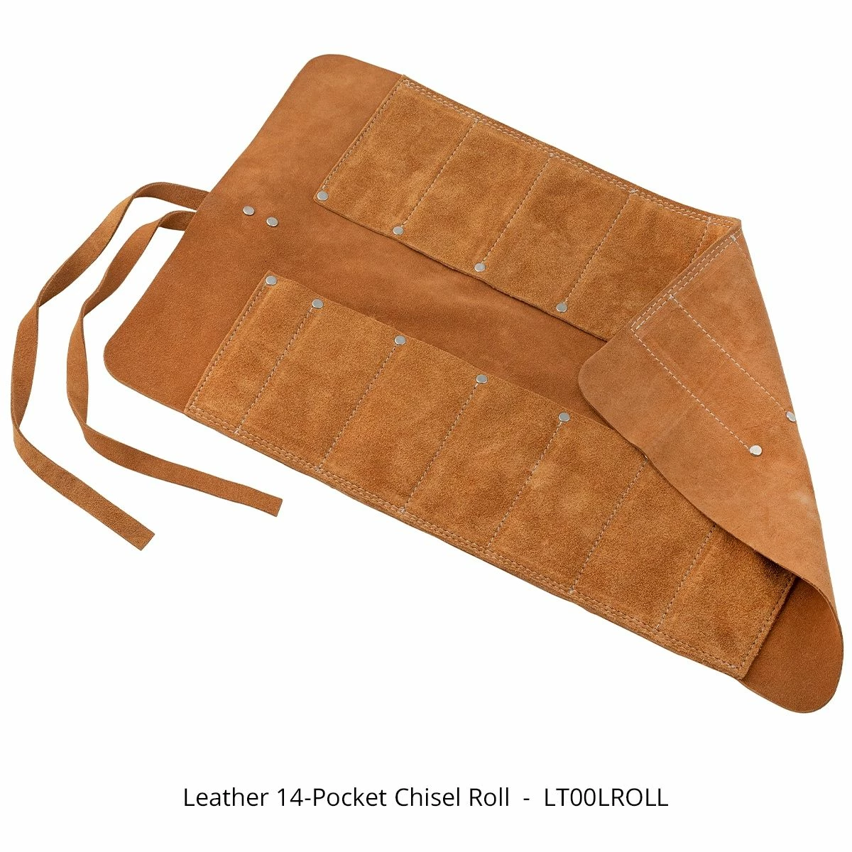 Protect your chisels with this high quality, leather tool roll. Made by Amish Craftsman to the protect your chisels for a lifetime. Keep up to 14 of your chisels organized and prevent damage to the cutting edges. Stitched and riveted for added strength. Pockets are almost 5” deep and vary in width from 1-1/8” to 2-1/8”. Total measurement 11-3/4″ x 21-1/4”. Made in USA.