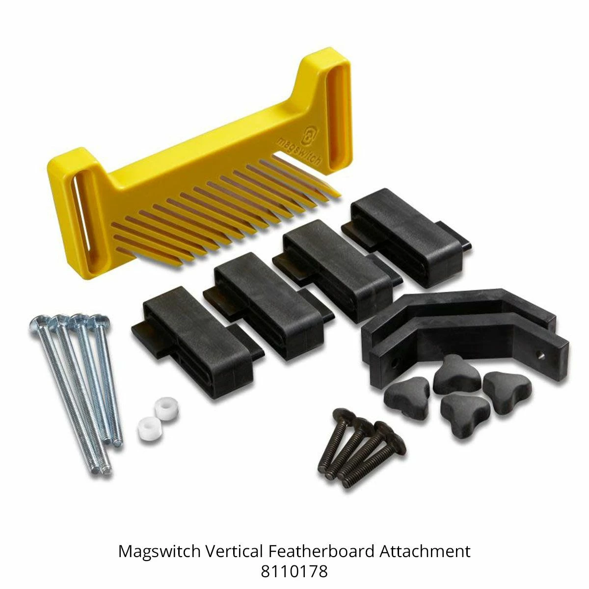 The Vertical Featherboard Attachment acts like three tools in one. When used with the Magswitch Pro Featherboard, the vertical attachment can be mounted in a vertical position from the top for pressure down on the material at the same time the horizontal featherboard is holding the material against the fence. When set up in the stacked position using the risers, you get dual featherboard hold on the same horizontal plane which is ideal for tall material and added protection against kickbacks on vertical and horizontal planes. Mountable to the Reversible Featherboard Attachment, Universal Mounting Base, and MacJigs.