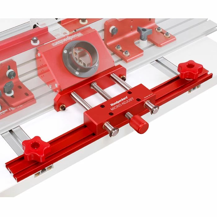The Micro Adjust attaches directly behind the center of the fence for easier parallel movement of the fence and maximum support where it’s needed most. The cross track attaches with knobs to the embedded T-track in Woodpeckers Router Tables making tool-free adjustment quick and easy.