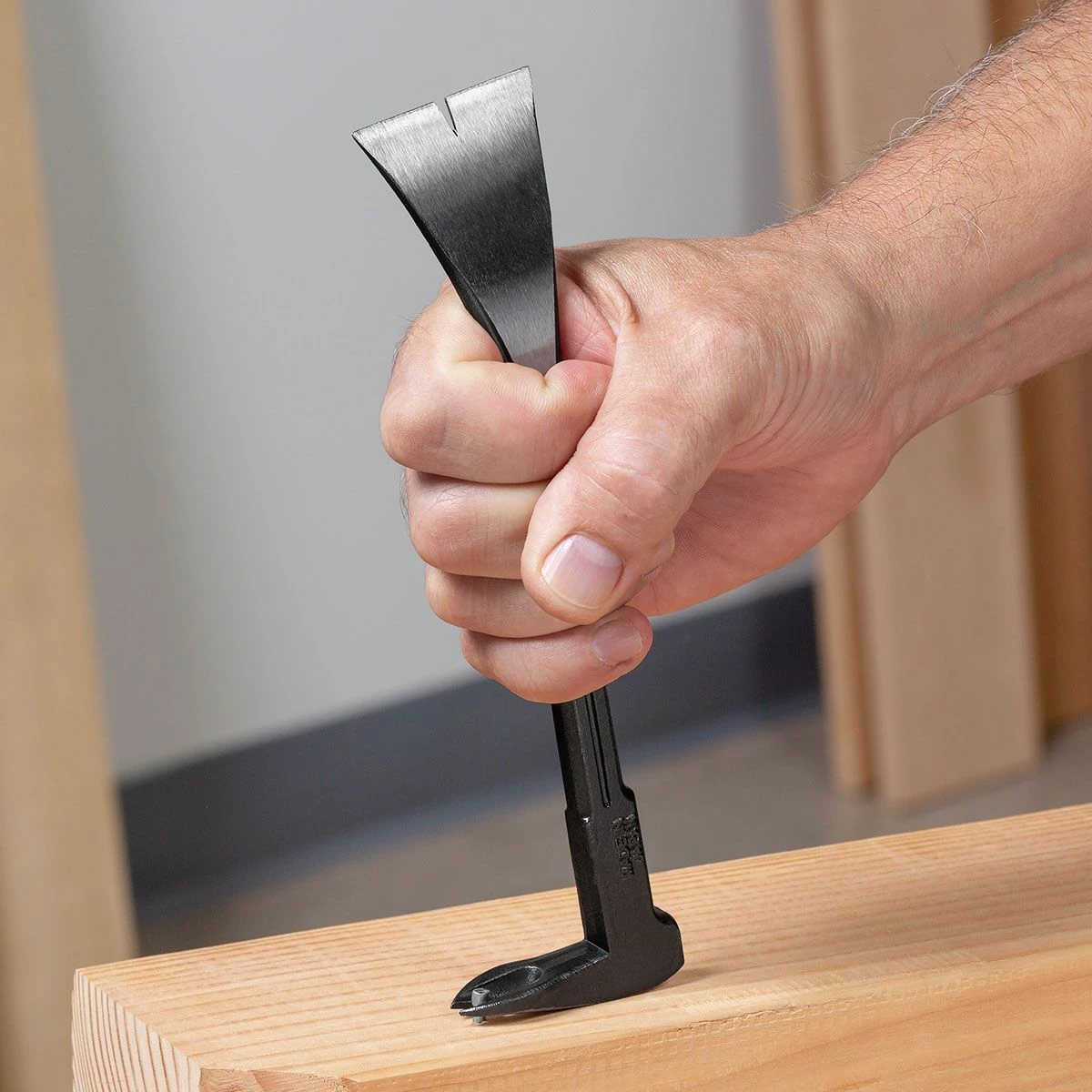 The pry bar is wide and very slender with a beveled edge allowing it to fit into joints easily and is curved to give maximum leverage when prying pieces apart. This pry bar has a split in it allowing it to be used to remove nails if required. At the other end, an angled cat’s paw with flat striking surface will remove nails quickly and may be driven around the nail with a hammer if required. The third function that this pry bar has to offer is its ability to be used as a hammer. The flat surface at the back of the cat’s paw may be used to drive nails. Made in Japan. Wide blade is 1-5/8” wide and bar is 8” in overall length.