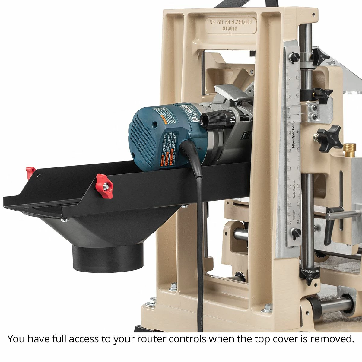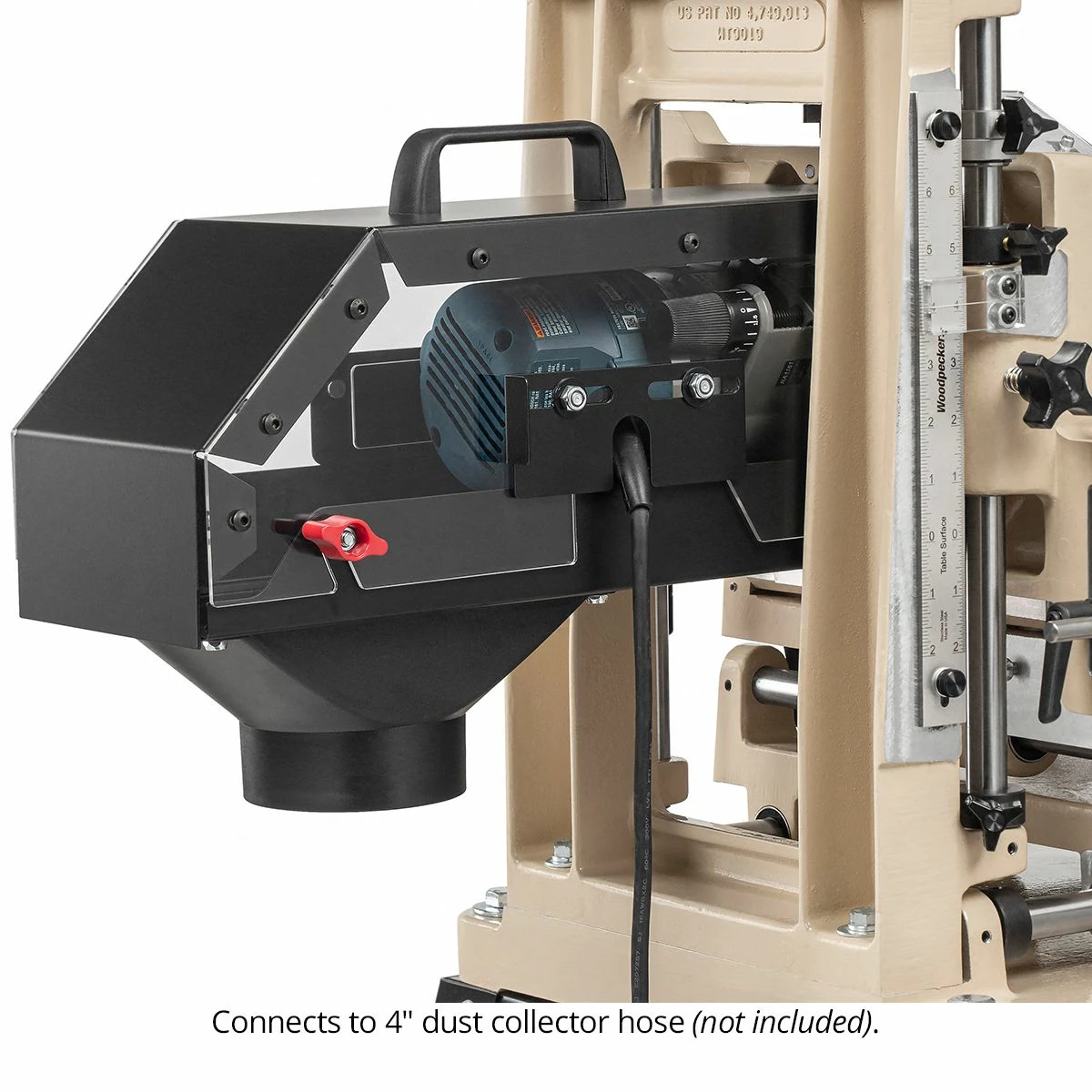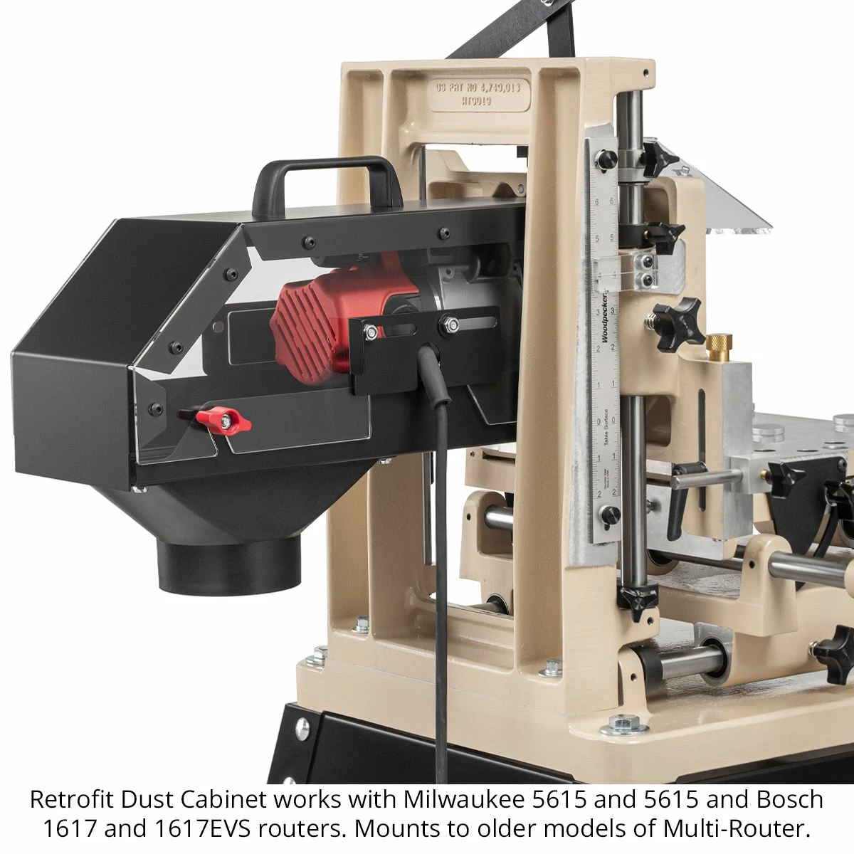 Evacuate most of the chips and nearly all the fine-particle dust from your working environment with the new Multi-Router Dust Cabinet. The retrofit model fits most Multi-Routers with the addition of a simple interface plate. NOTE: Models with “1021” engraved in the vertical table as shown in the photo require a slightly different model (call Customer Service to place your order if you have a “1021” machine). One access door flips open allowing you to reach the switch. Another slides side-to-side, adjusting with the router position for cord clearance. Top lifts off easily for full access to your router for adjustments and bit changes. Attaches to 4″ dust collection hose. Works with Milwaukee 5615 and 5616 and Bosch 1617 and 1617EVS only. Depth of cut reduced by 3/8″. Includes 30lb. lift assist gas spring and mounting hardware. Included with new Multi-Routers.