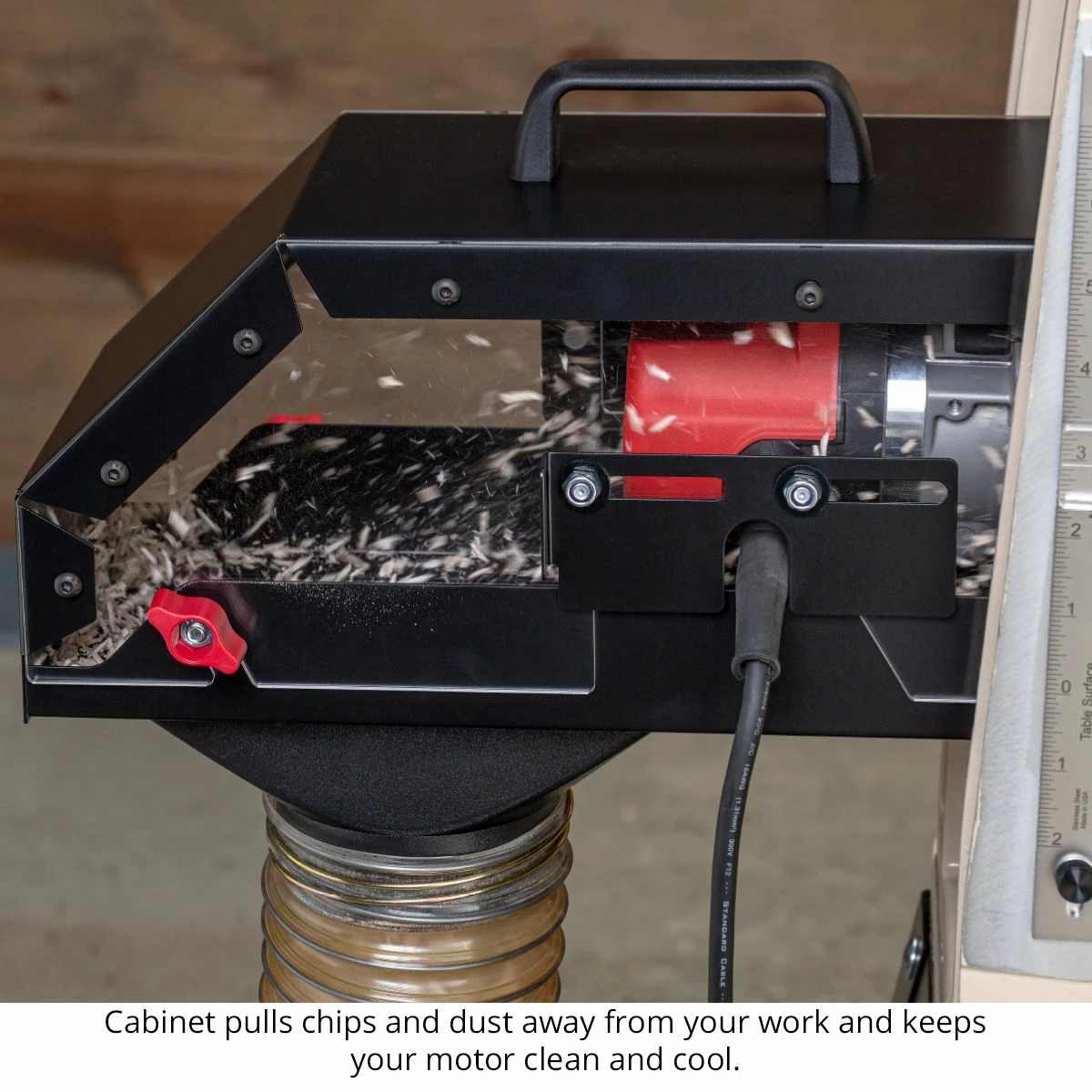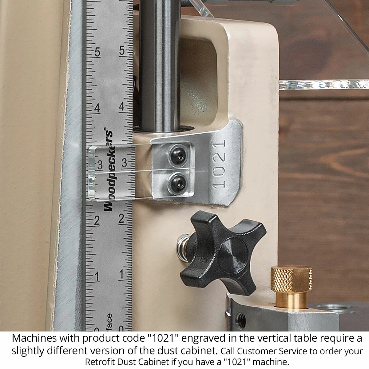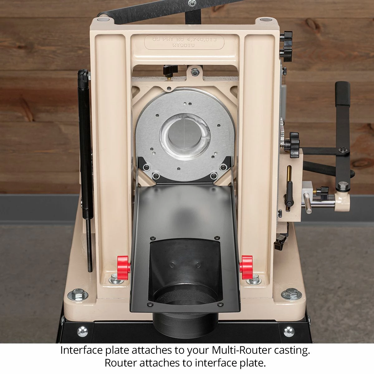 Evacuate most of the chips and nearly all the fine-particle dust from your working environment with the new Multi-Router Dust Cabinet. The retrofit model fits most Multi-Routers with the addition of a simple interface plate. NOTE: Models with “1021” engraved in the vertical table as shown in the photo require a slightly different model (call Customer Service to place your order if you have a “1021” machine). One access door flips open allowing you to reach the switch. Another slides side-to-side, adjusting with the router position for cord clearance. Top lifts off easily for full access to your router for adjustments and bit changes. Attaches to 4″ dust collection hose. Works with Milwaukee 5615 and 5616 and Bosch 1617 and 1617EVS only. Depth of cut reduced by 3/8″. Includes 30lb. lift assist gas spring and mounting hardware. Included with new Multi-Routers.