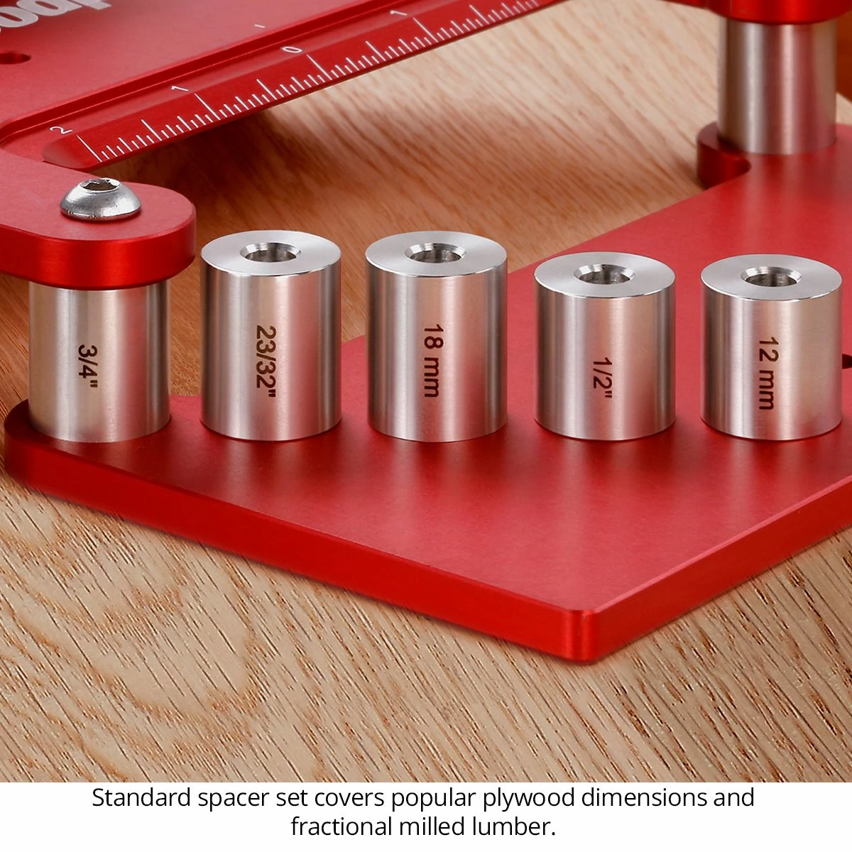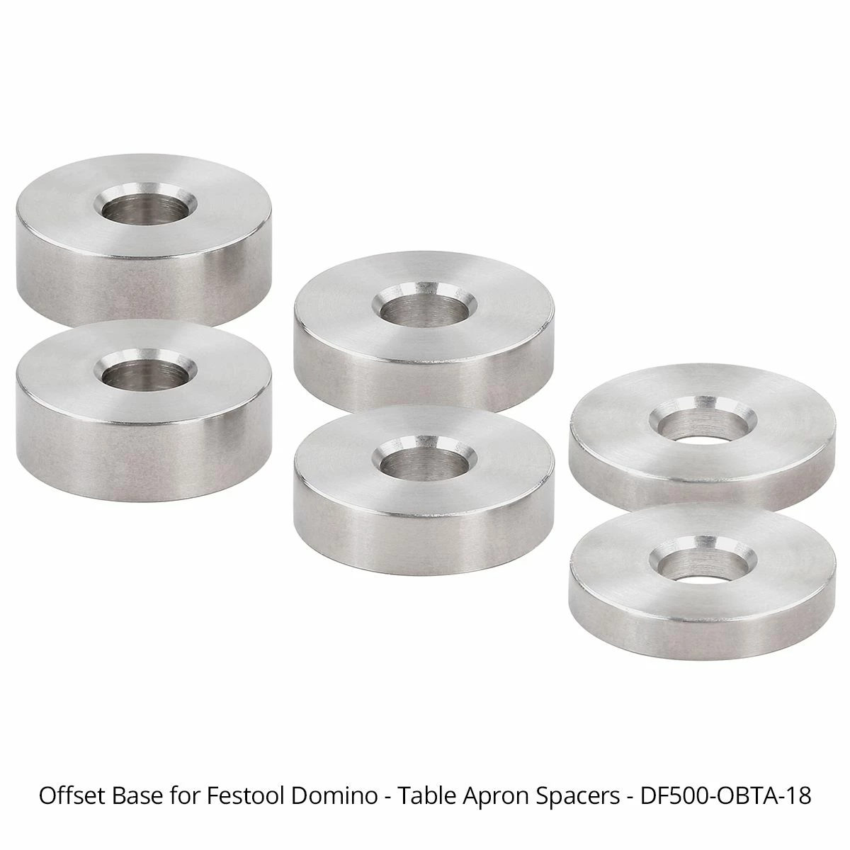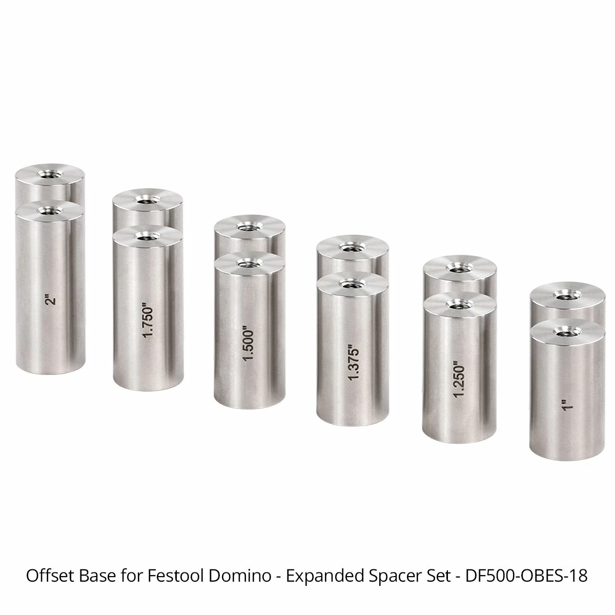 The system starts with a very flat, carefully machined base that fastens to the bottom of the Domino (either model…DF-500 or DF-700). The reference plate (the part you hold against the top of your material) is joined to the base with stainless steel spacers. It’s the length of those spacers that determines the position of your mortise. By simply changing the spacers you can center your mortises in five different material thicknesses; 1/2″, 12mm, 18mm, 23/32″ (the size of most 3/4″ plywood) and 3/4″. There are .005″ shims to tweak the mortise position to even tighter tolerance and an optional expanded spacer set that gives you 6 additional options for thicker material (1″, 1-1/4″, 1-3/8″, 1-1/2″, 1-3/4″ and 2″).