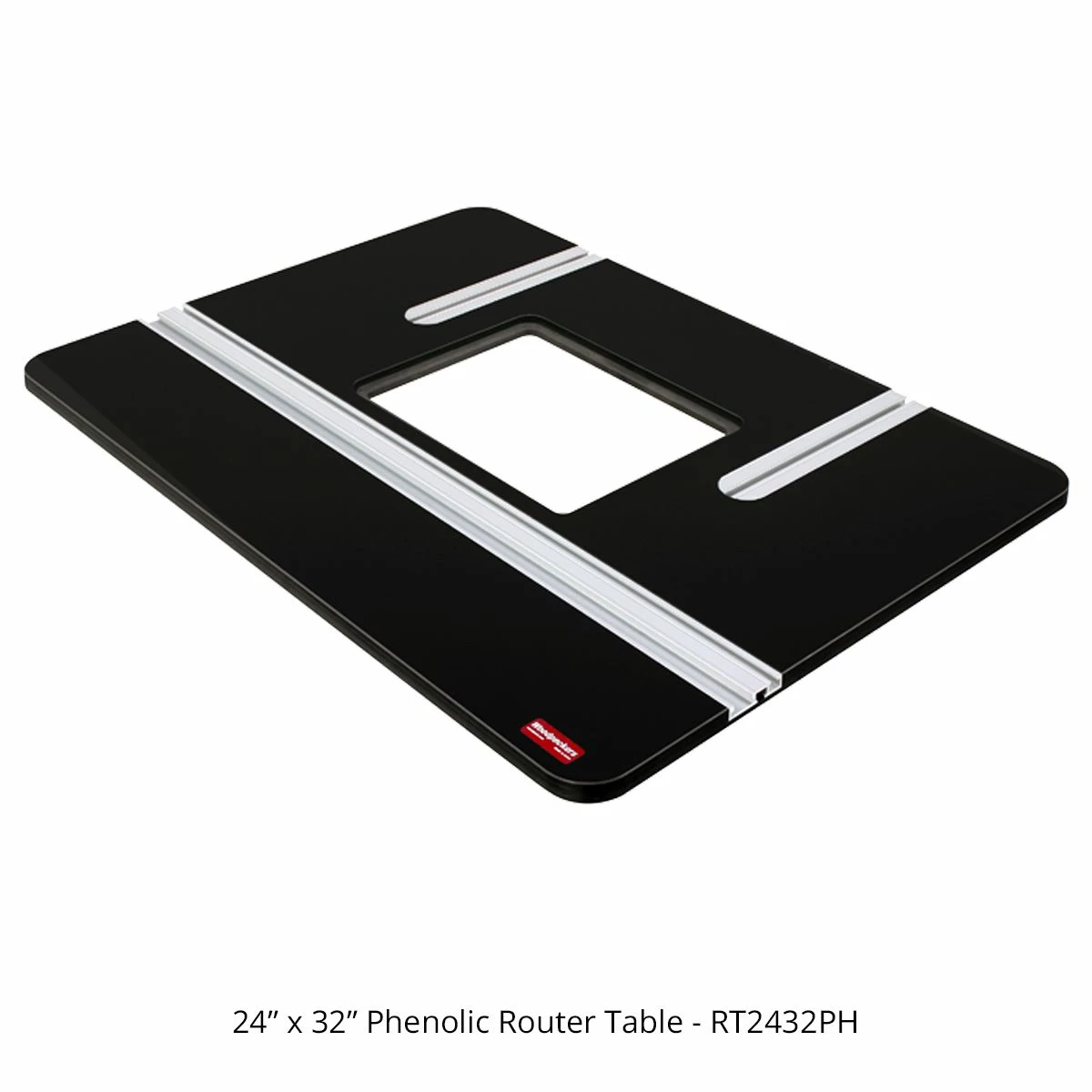 A combination miter channel and T-track as well as two fence mounting tracks are embedded into the table top. Each table is pre-drilled with threaded holes for attaching to our steel router table stands. (Router Table Stand #RTS2027 fits the #RT2432-PH router table and the #RTS2037 fits the #RT2743-PH router table).