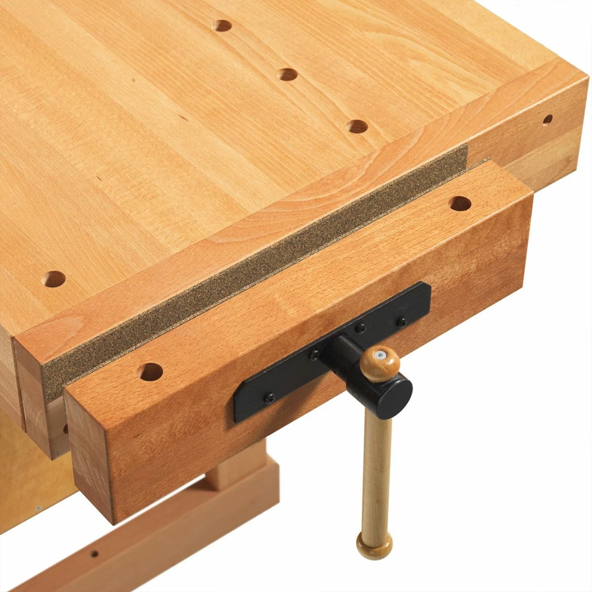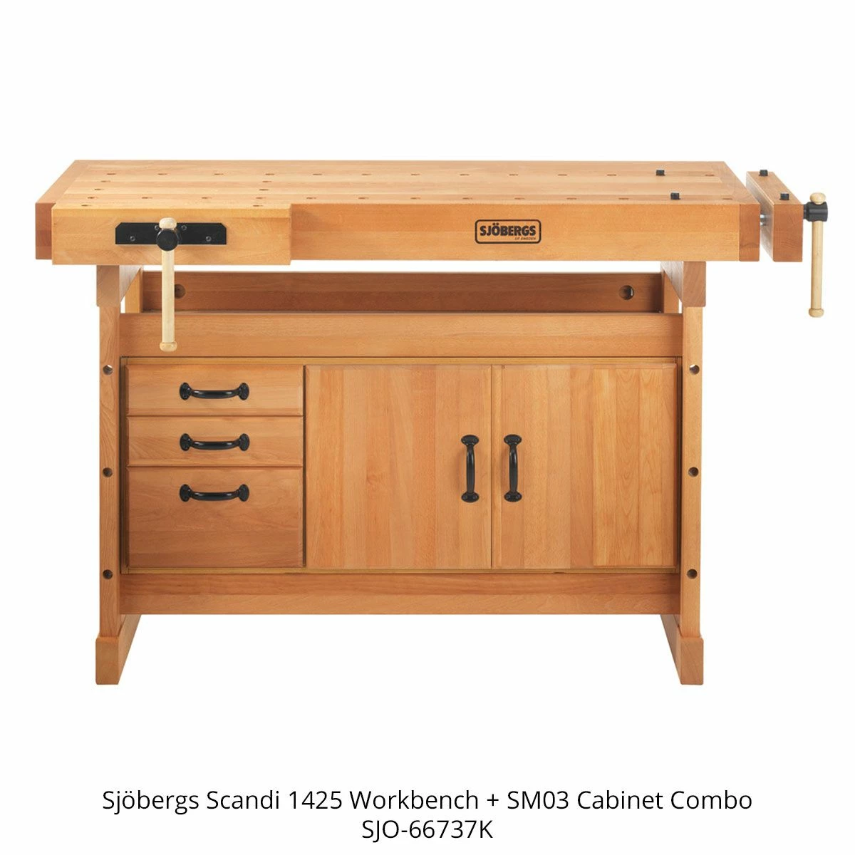 Made by professionals for professionals, Sjobergs Scandi Plus 1425 Workbench is at the top of its class for serious woodworkers, craftsmen, and hobbyists alike. The ultimate long-term workbench solution, the Scandi Plus 1425 workbench is suited for modest to medium sized shops where space is at a premium. Constructed of solid beech and finished with top-quality oil. The bench top measures 52 5/8” long by 22 13/16” wide. Overall size is 57 5/8” by 27 15/16” with a working height of 35-7/16”. Featuring two heavy-duty vises and double rows of 3/4″ dog holes that run from each vise location to give you utmost versatility when working on projects of any size or shape.