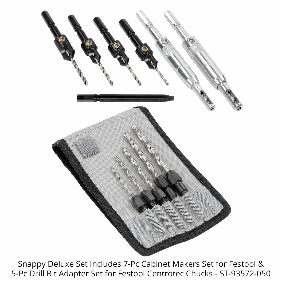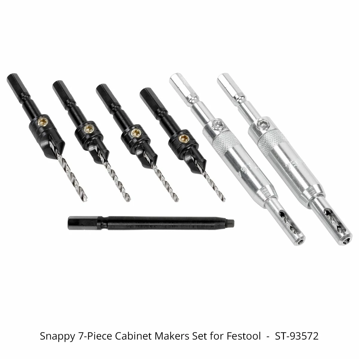 Snappy offers you this great Cabinet Maker’s Set that includes a 3/32”, 7/64”, 1/8” and 9/64” Countersinks, 7/64” and 9/64” Hinge Bits, a #2 x 3” Square Driver and hex key! These particular bits can be used in any drill chuck but have the added advantage of being specifically sized to fit the Centrotec Chucks on the Festool Drills.