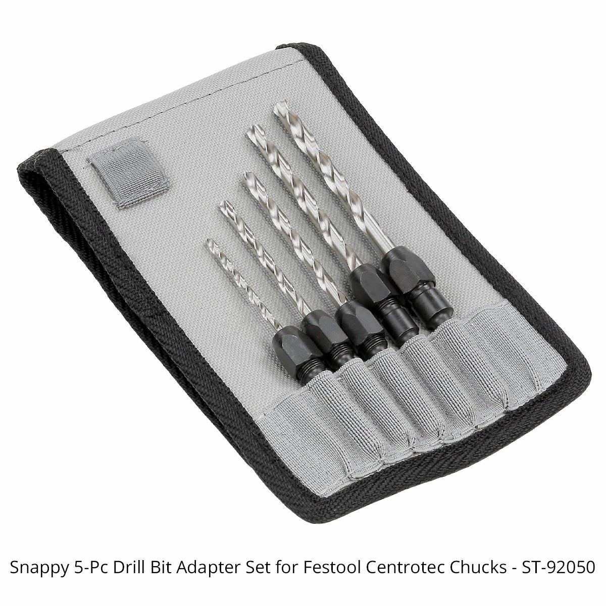 The 5 Piece Drill Bit Adapter Set includes 1/8”, 5/32”, 3/16”, 7/32” and 1/4” adapters with corresponding High-Speed Steel Twist Drills! These adapters accept virtually any type bit with a collet design that allows the diameter of the shank to vary from .005” oversized to .010” undersized. This set even includes a handy belt clip pouch and hex socket for easy drill replacement. These particular bits can be used in any drill chuck but have the added advantage of being specifically sized to fit the Centrotec Chucks on the Festool Drills.