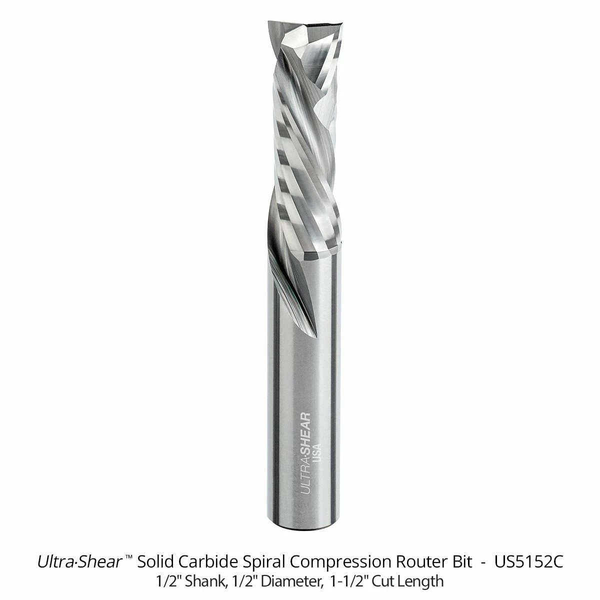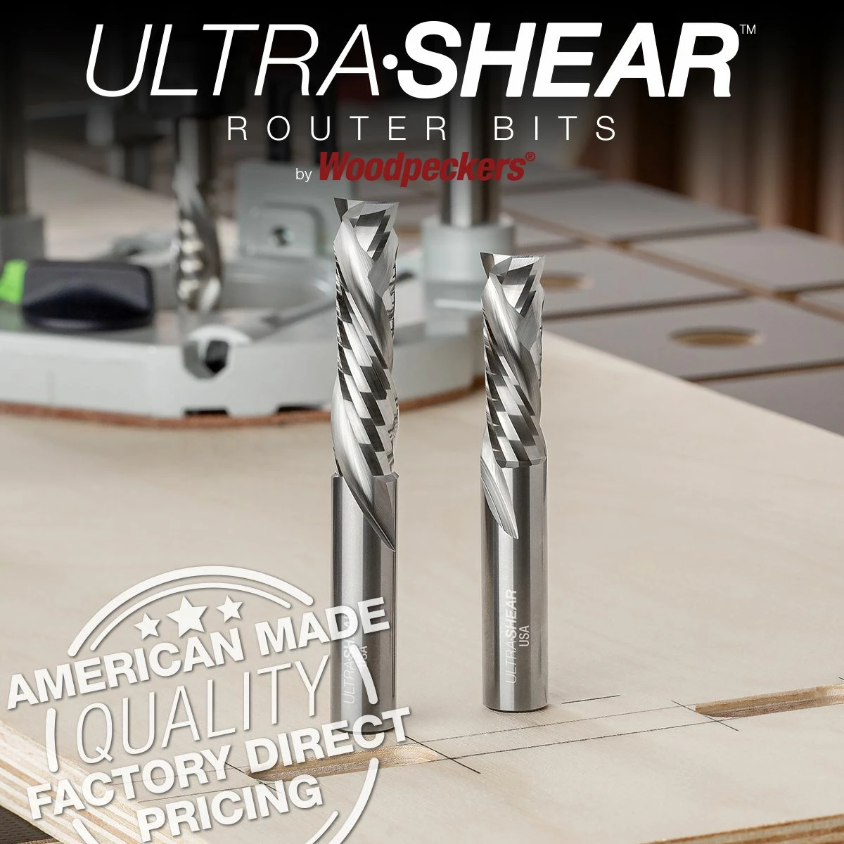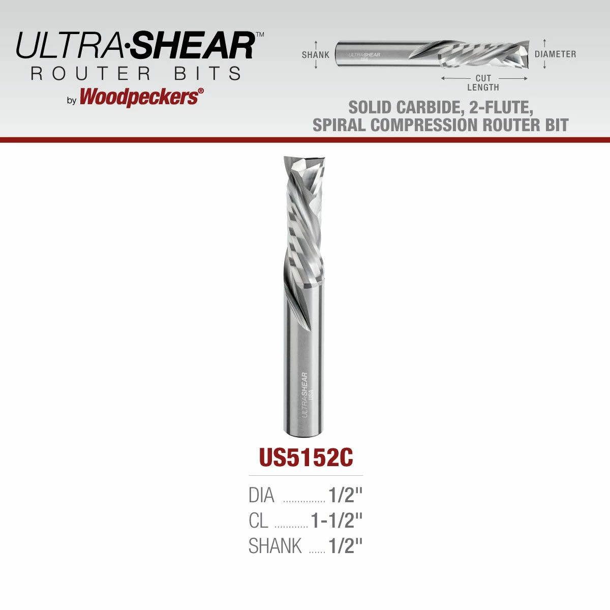 Woodpeckers makes Ultra-Shear 1/2″ Compression Bits in two cut lengths; 1-1/2″ and 2″. Use the one closest to the thickness of your material. Don’t settle for inferior quality imported bits to save money. Woodpeckers uses state-of-the-art CNC grinding equipment, the highest quality solid carbide blanks and ultra-fine grinding wheels to produce American-made router bits at extremely competitive prices. The days of paying extra for middle-man markups are over. Buy direct from the manufacturer and pocket the savings.