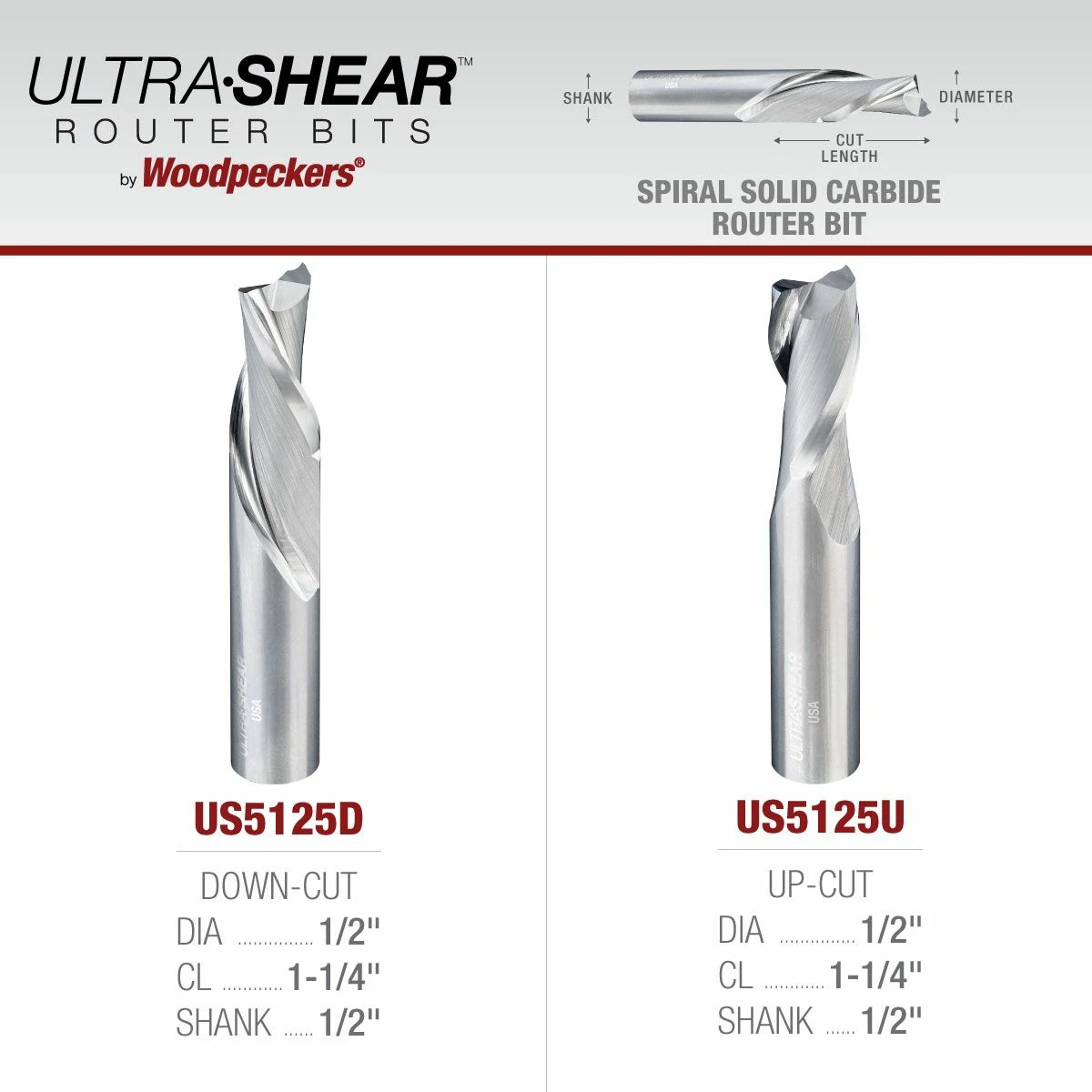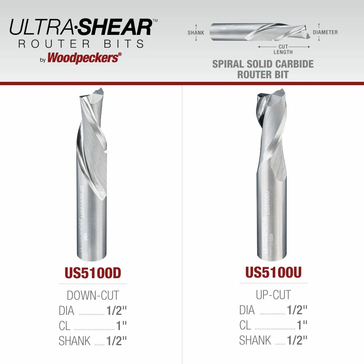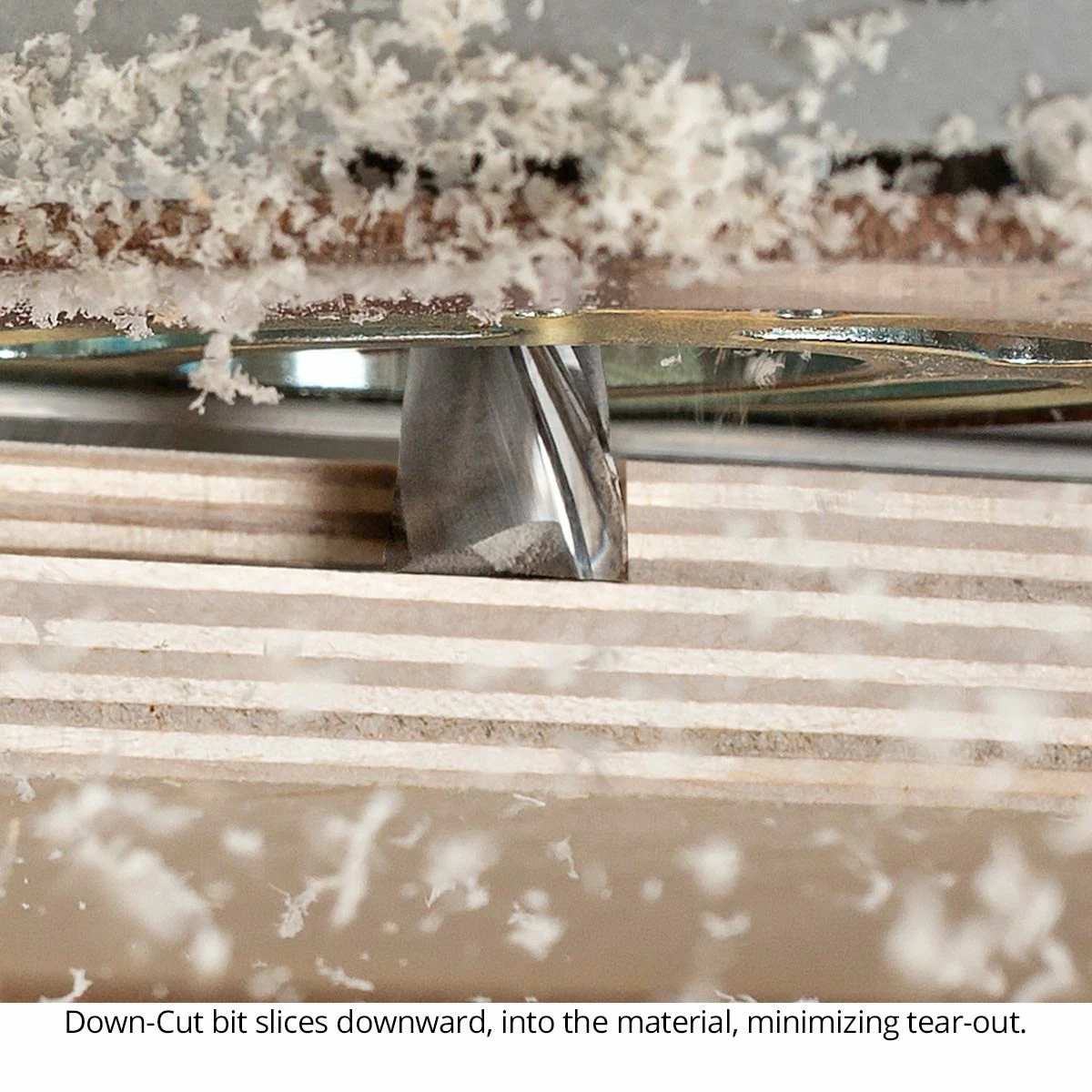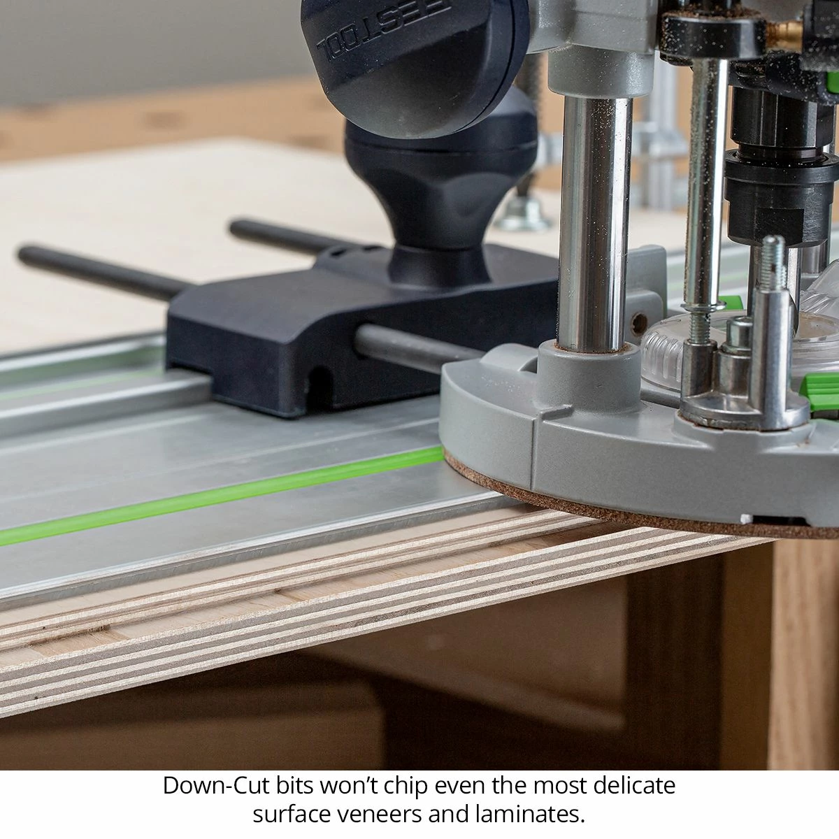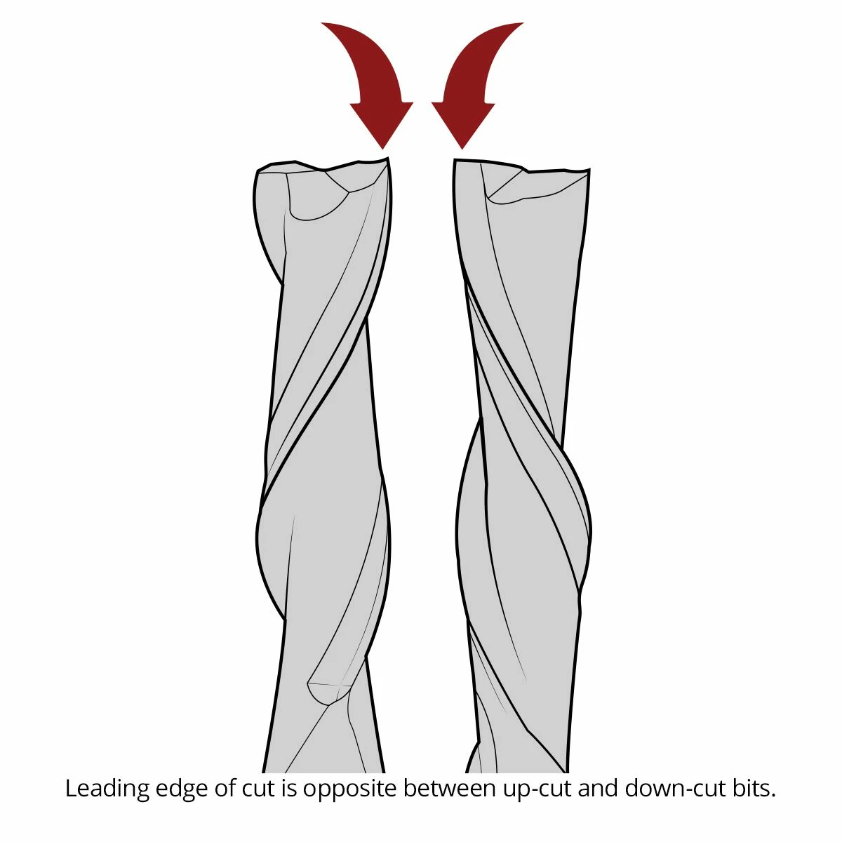 Up-Cut or Down-Cut? Up-Cut bits pull the chips toward the router, cleaning out the cut area quickly. They’re generally the preferred approach, unless you’re working with a type of plywood that tends to chip with an Up-Cut. Down-Cut bits slice downward into the material, eliminating tear-out.