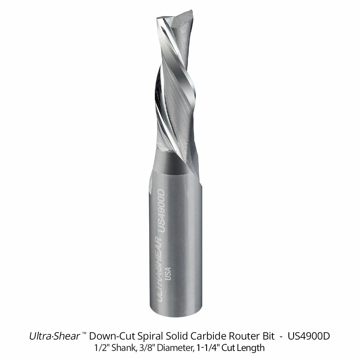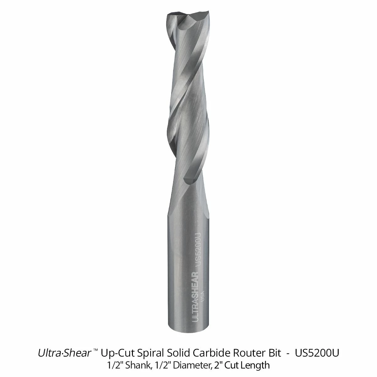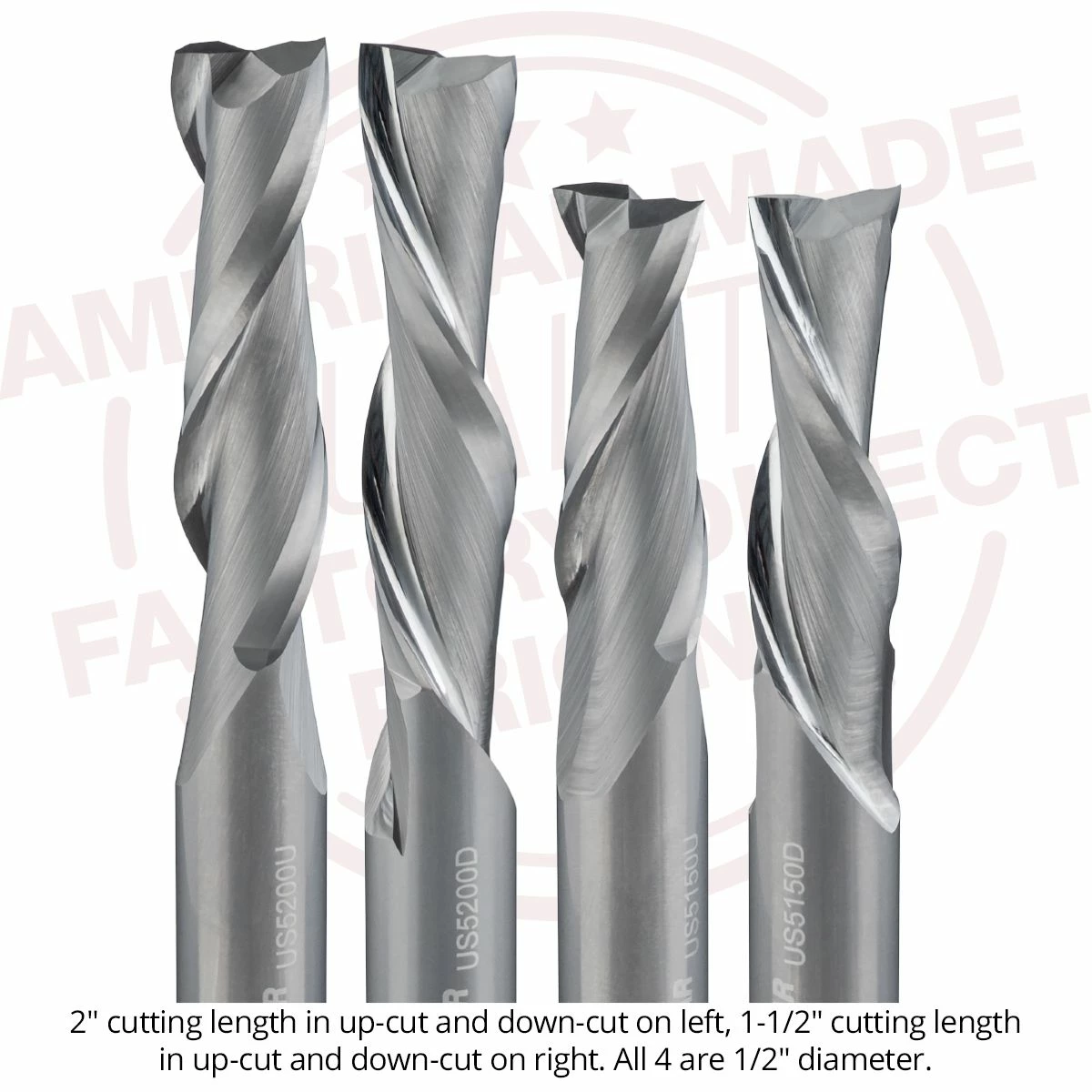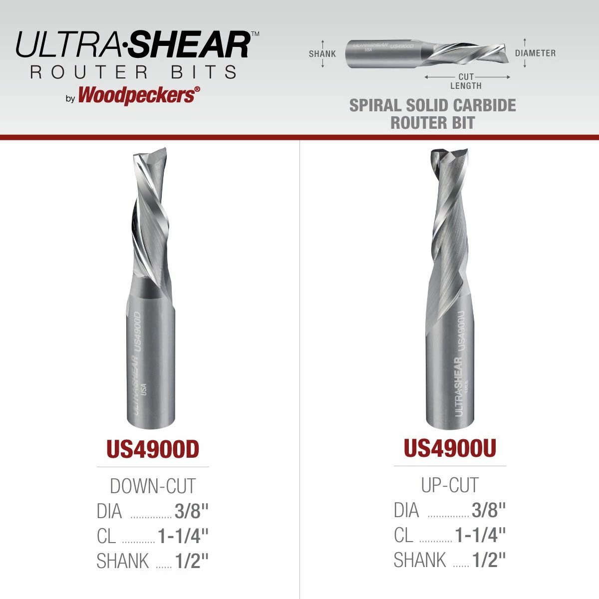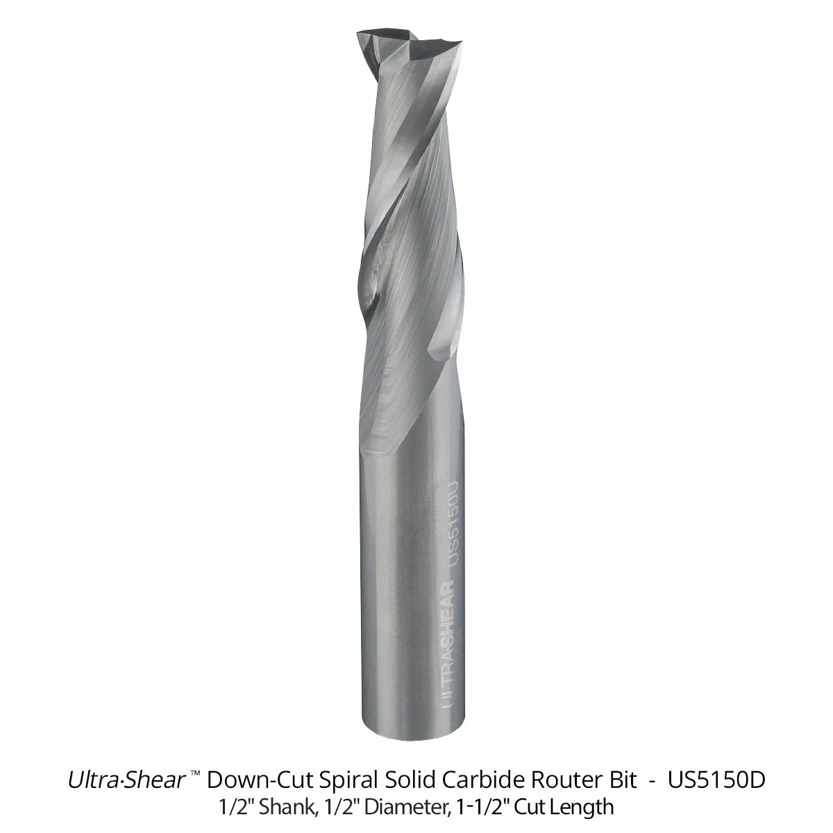 Up-Cut or Down-Cut? Up-Cut bits pull the chips toward the router, cleaning out the cut area quickly. They’re generally the preferred approach, unless you’re working with a type of plywood that tends to chip with an Up-Cut. Down-Cut bits slice downward into the material, eliminating tear-out.
