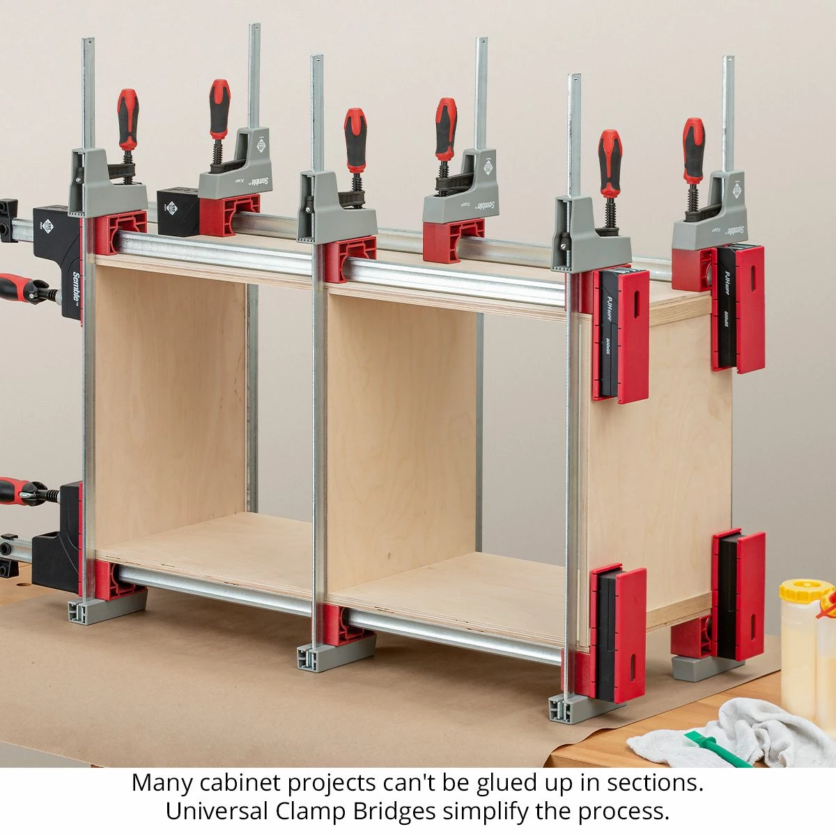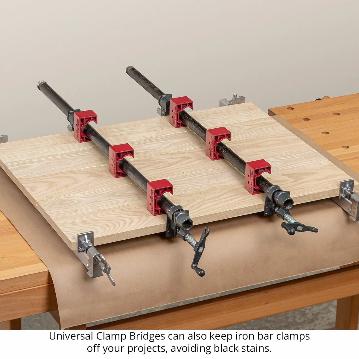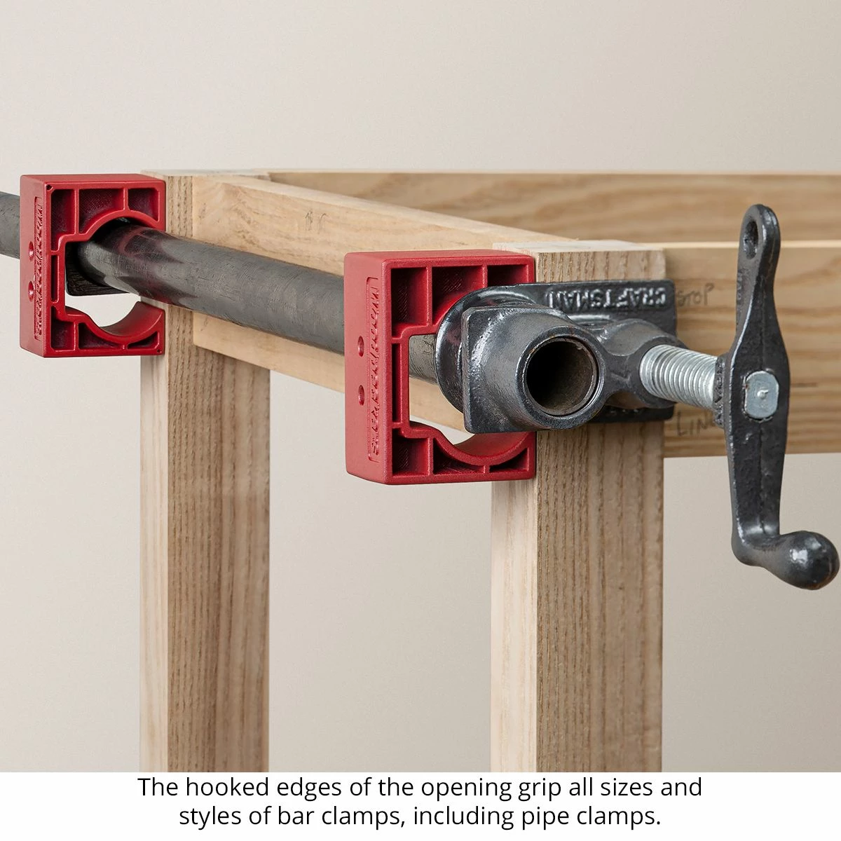 If you’ve tried to do something similar with wood scraps, chances are you met with some frustration. The blocks just never seem to want to stay where you put them. Decades of facing this issue while building and repairing furniture led our friend Tom DelVecchio to sit down at the drawing board and consider the ideal size and shape. Tom came up with an opening that spans pipe clamps, all brands of parallel jaw clamps, aluminum bar clamps, heavy-duty steel bar clamps, F-clamps and of course anything smaller. To keep them in place he shaped the hooked edge to grab even the tiniest chamfer on a clamp’s bar and stay in place while you position the next clamp.
