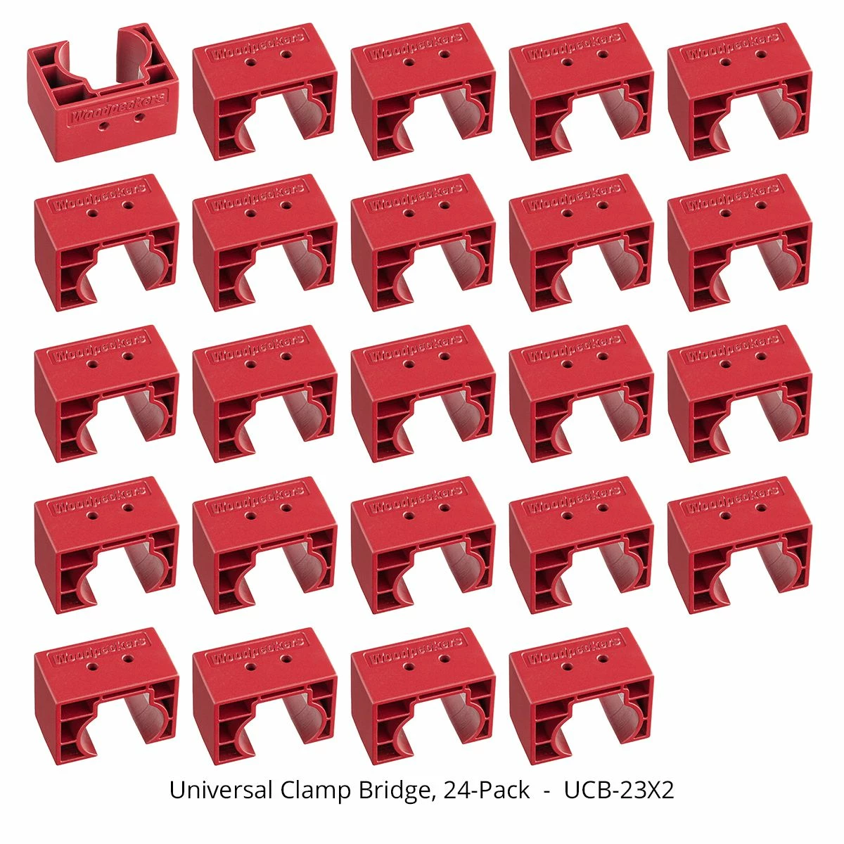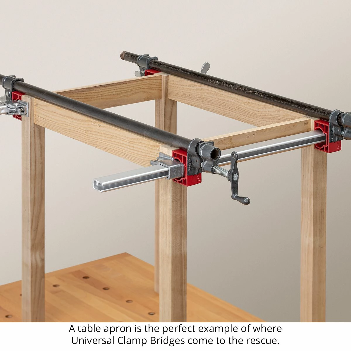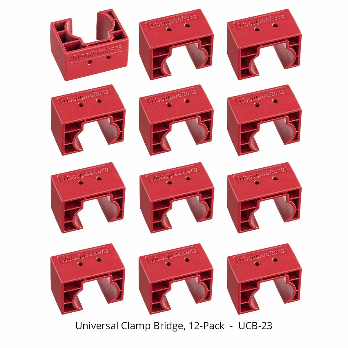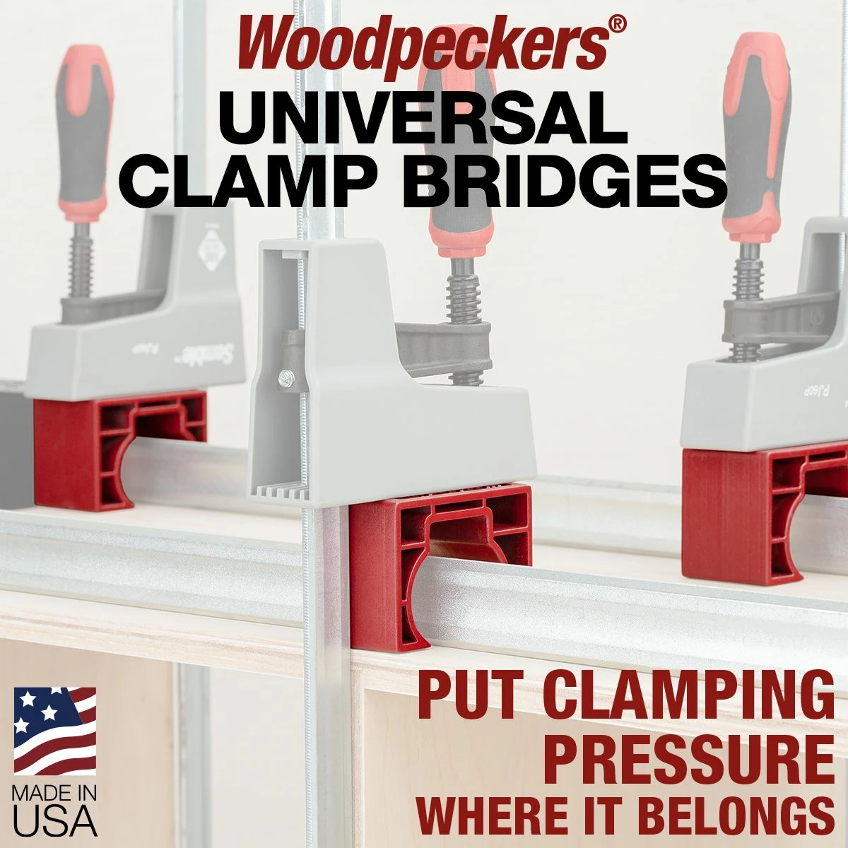 If you’ve tried to do something similar with wood scraps, chances are you met with some frustration. The blocks just never seem to want to stay where you put them. Decades of facing this issue while building and repairing furniture led our friend Tom DelVecchio to sit down at the drawing board and consider the ideal size and shape. Tom came up with an opening that spans pipe clamps, all brands of parallel jaw clamps, aluminum bar clamps, heavy-duty steel bar clamps, F-clamps and of course anything smaller. To keep them in place he shaped the hooked edge to grab even the tiniest chamfer on a clamp’s bar and stay in place while you position the next clamp.