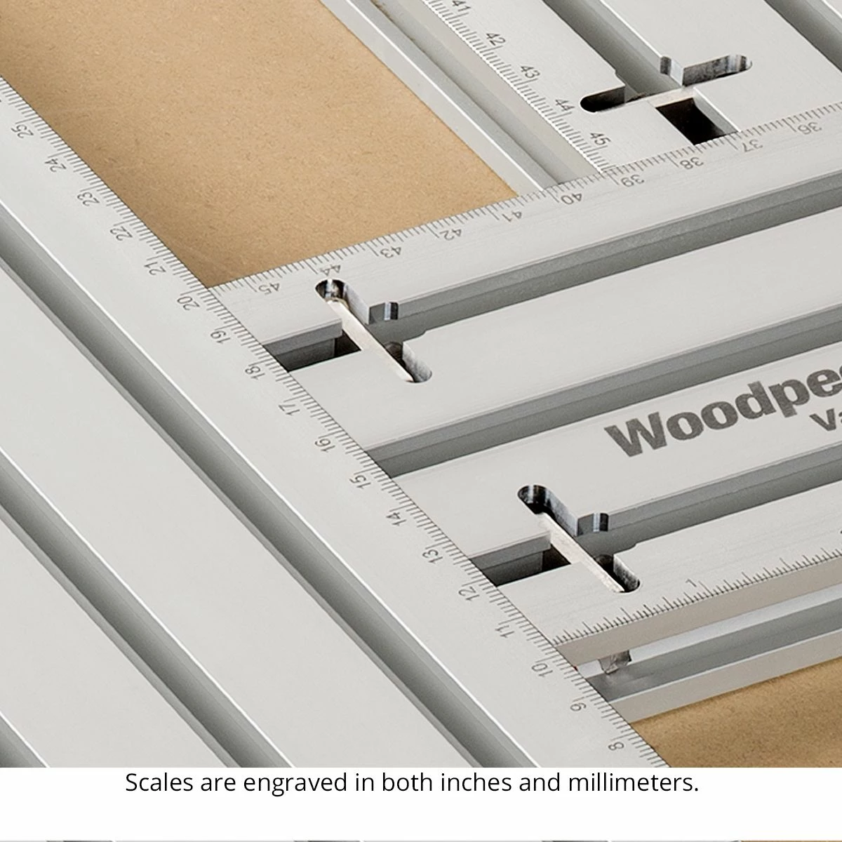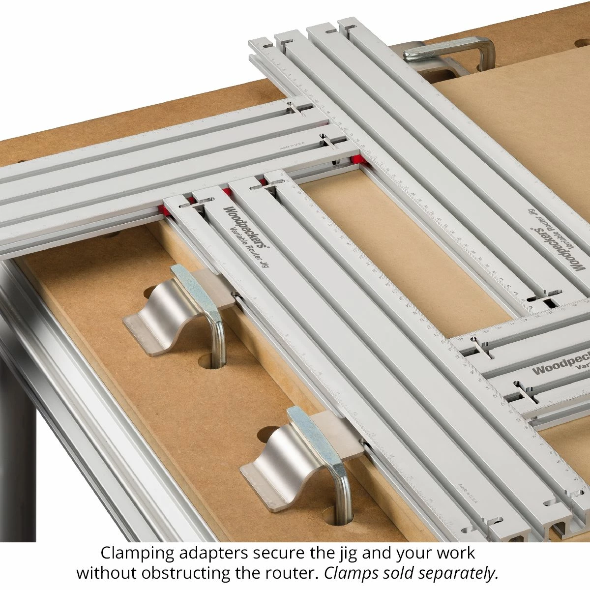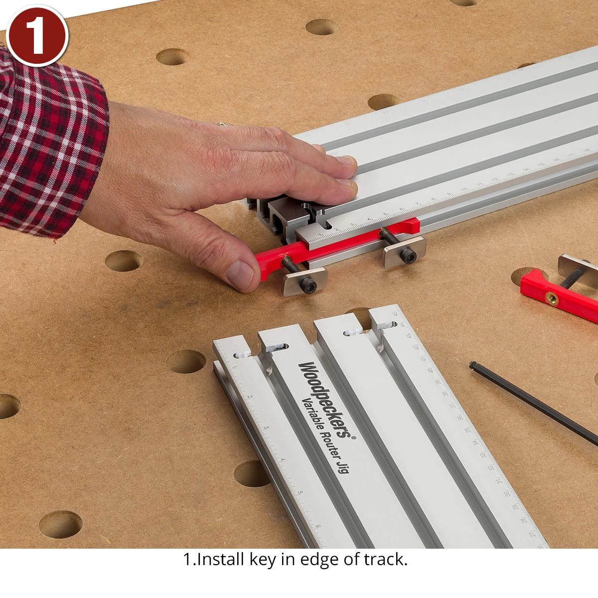 Fast Setup and Easy Reconfiguration. You can assemble the jig in minutes. Calculate the offset from your guide bushing to the edge of your router bit. Both metric and fractional scales are laser engraved on tracks. Put the scale you prefer on the inside, slide the lockbars into the edges, adjust to dimension, tighten the clamps with the supplied ball tip wrench and you’re ready to rout. When you need to reconfigure for the next step, just loosen the socket head cap screws, slide the tracks to the new dimensions, lock it back up and get back to work.