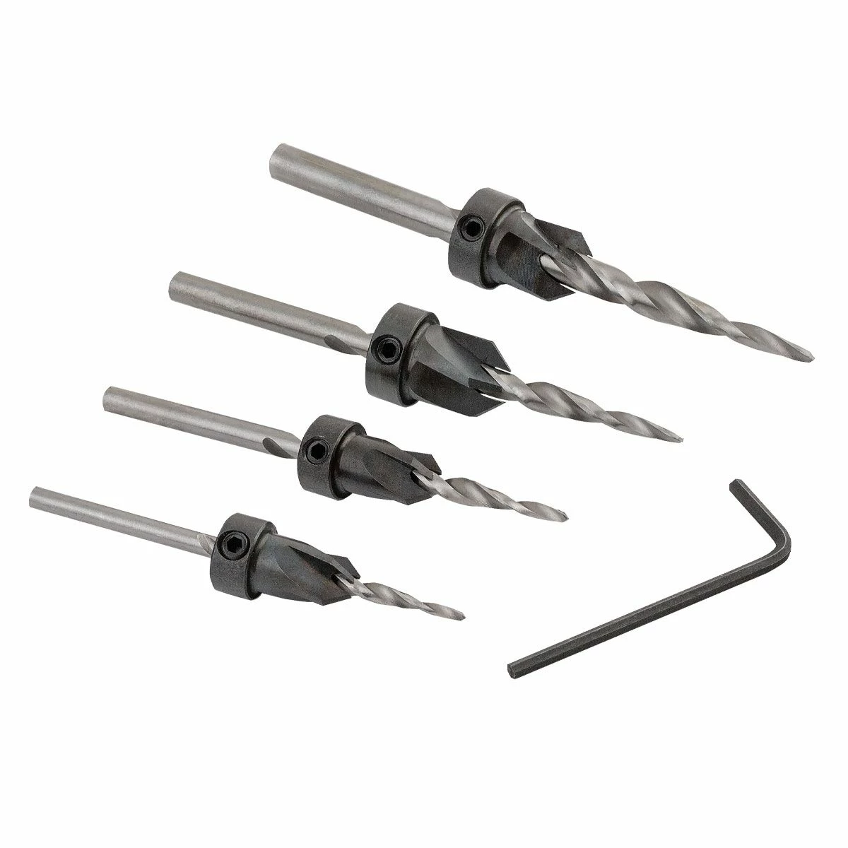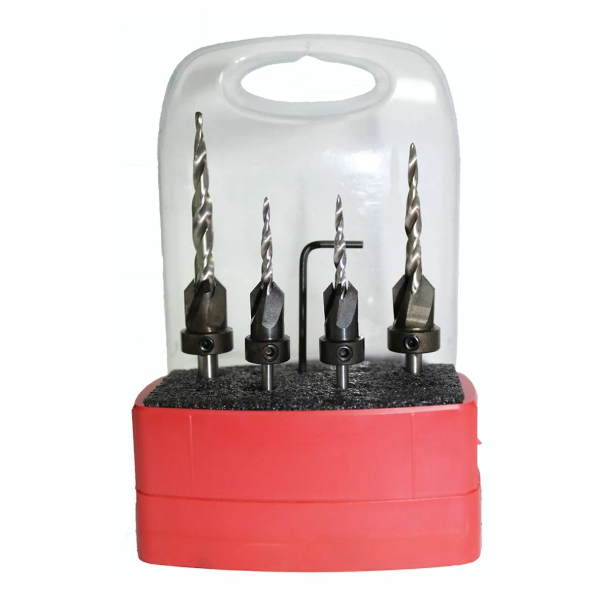 Whiteside’s 82° Countersink Heads are designed to slip over the drill bit and affix with dual set screws into the flutes. Adjust the drilling length by sliding the head up or down the bit. You can countersink clean holes in wood, plastic, or aluminum for flat head screws. These bits provide quick chip ejection and less heat during drilling and clean holes with 4-flute, carbon steel countersinks. Available in a 4-piece set that includes 4 carbon steel countersinks and 4 high-speed steel taper point drill bits.