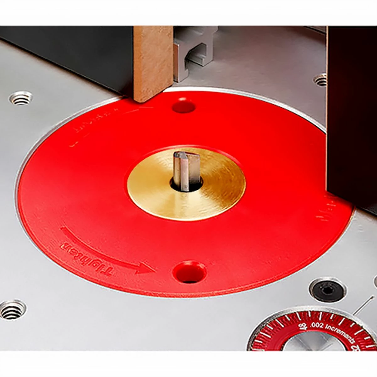 This set of solid brass inserts fit into the “step ring” that comes standard with every Woodpeckers twist lock style router mounting plate or router lift. They reduce the gap around the router bit to make it safer, reduce tearout and to help support smaller pieces of stock. This set includes openings of 1/4″, 3/8”, 1/2”, 5/8”, 3/4″, 7/8”and 1” plus the retaining nut. The openings are slightly oversized for tool clearance. Fits any standard 1-3/16” diameter recessed hole for template guides.
