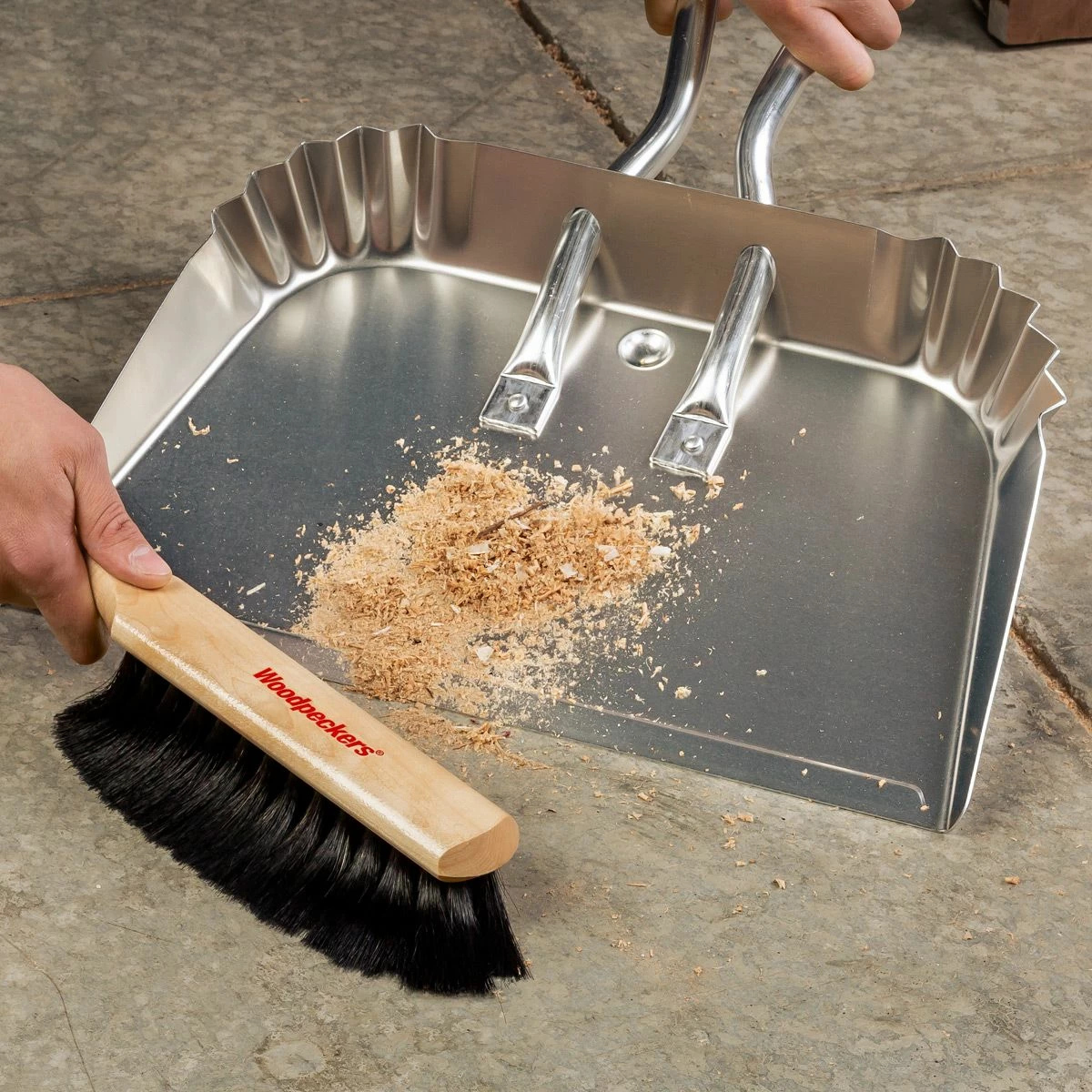 You can always count on Woodpeckers for high-quality, high-precision woodworking tools, but now you can count on Woodpeckers for shop cleanup, too! Our signature Dustpans are suited for rugged shop use—made from heavy-duty aluminum and designed to sit flat on the floor without having to be held. Sweep up your debris with the high-quality Woodpeckers Bench Brush—a static-neutral handle with anti-static, soft horse-hair bristles. Dustpans are available in two sizes: 11 1/2” wide and 17” wide. Our Bench Brushes are 13 1/2” long with a 1/4″ by 2 3/4” brush fade. Made in the USA.