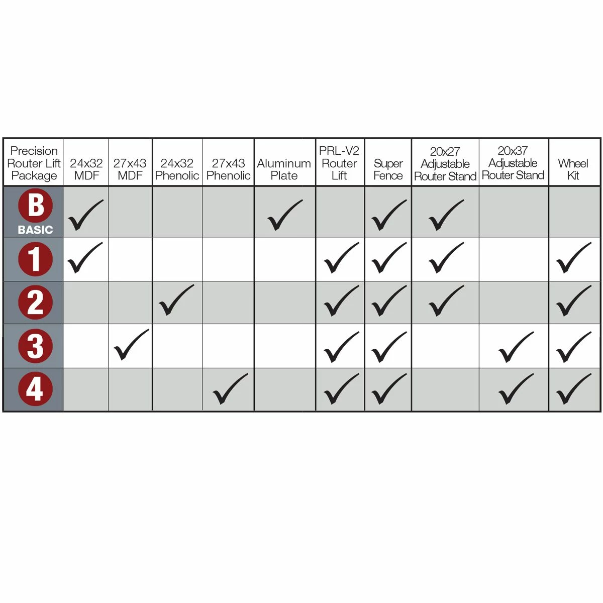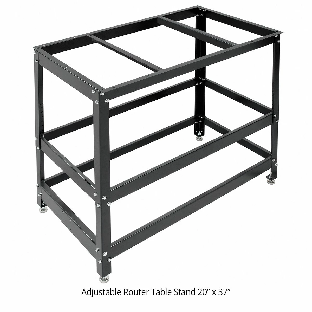 This package also includes our powder coated 14 gauge steel Router Table Stand which supports the table with six braces and is vertically adjustable from 36” to 42”. The Wheel Kit allows for easy mobility with a simple push of a foot pedal.