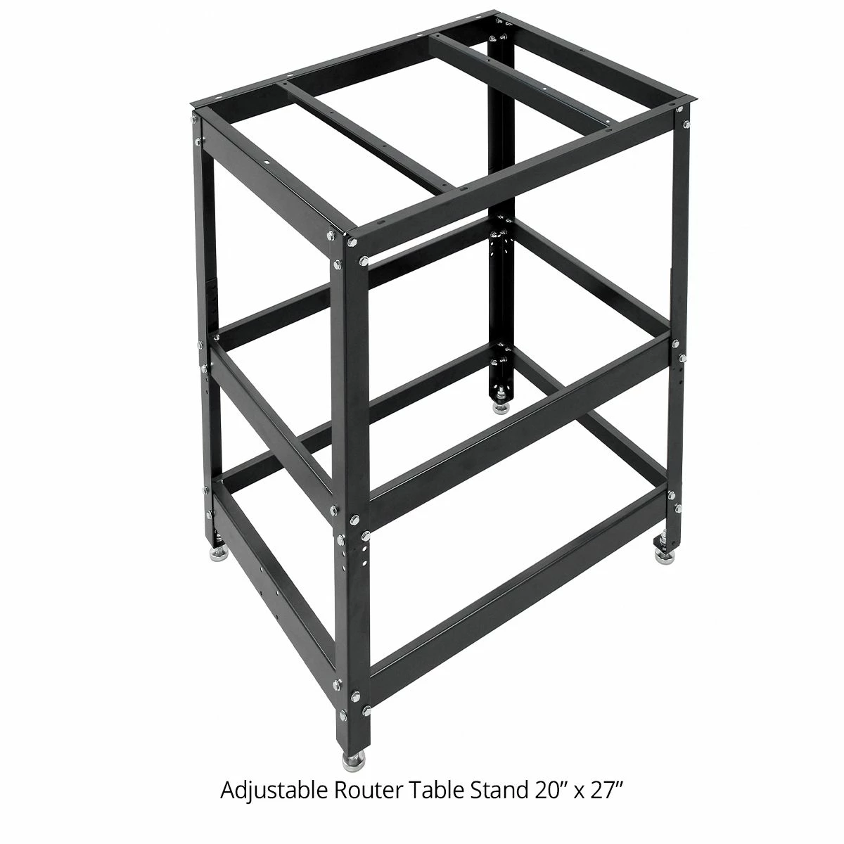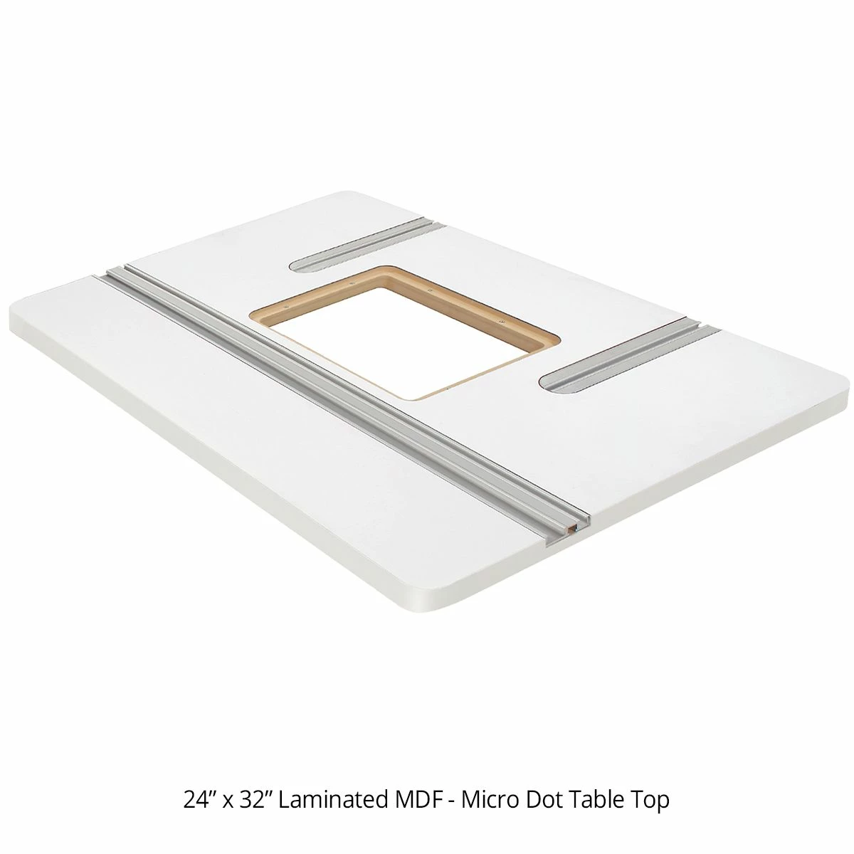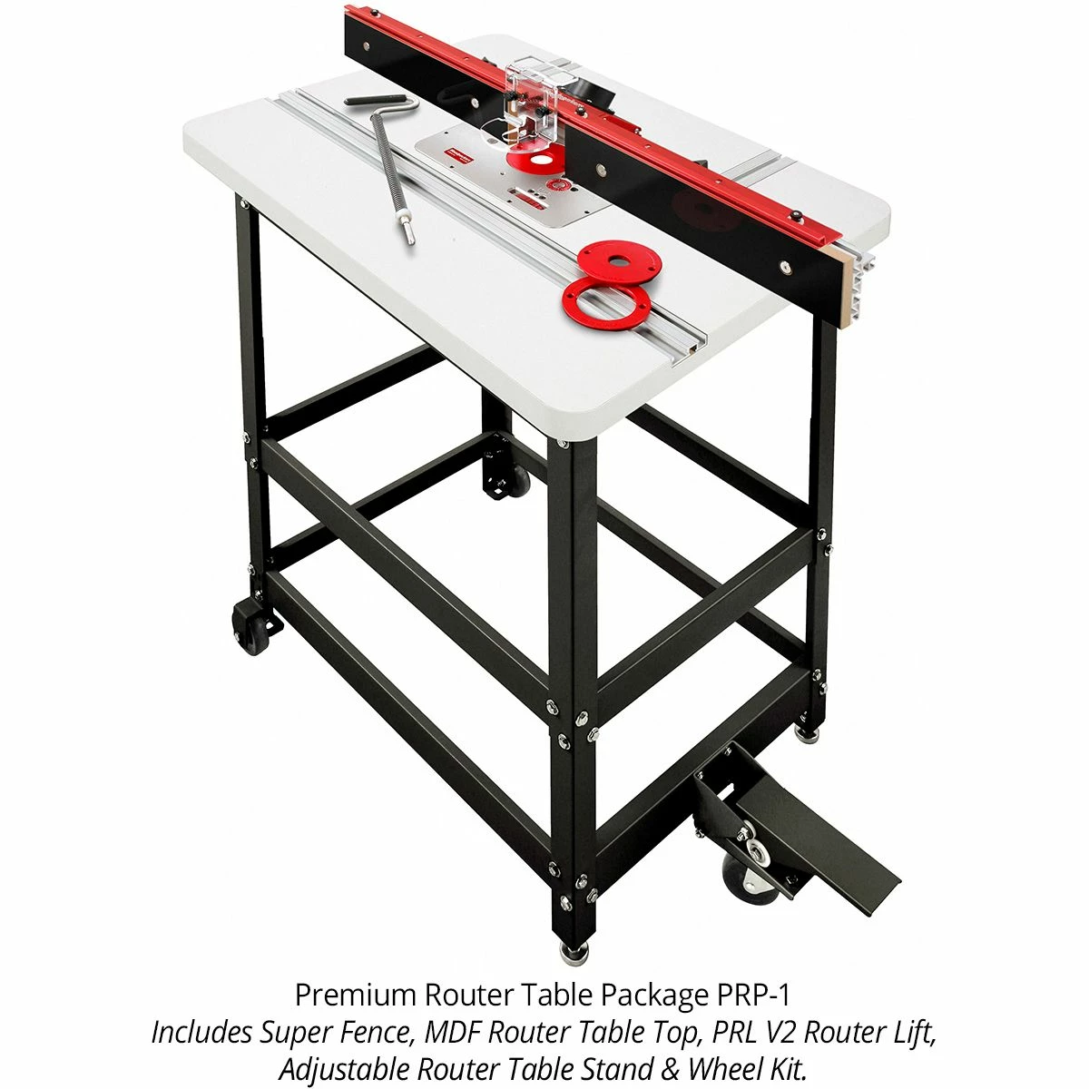 The table also features an embedded combination miter and T-track. The 3/8 x 3/4 miter channel is compatible with miter gauges, cross cut tools, feather boards and coping sleds. The 9 ¼ ” x 11 ¾ ” x 3/8″ table opening fits most standard router plates and lifts. This package also includes our powder coated 14 gauge steel Router Table Stand which supports the table with six braces and is vertically adjustable from 36” to 42”. The Wheel Kit allows for easy mobility with a simple push of a foot pedal.