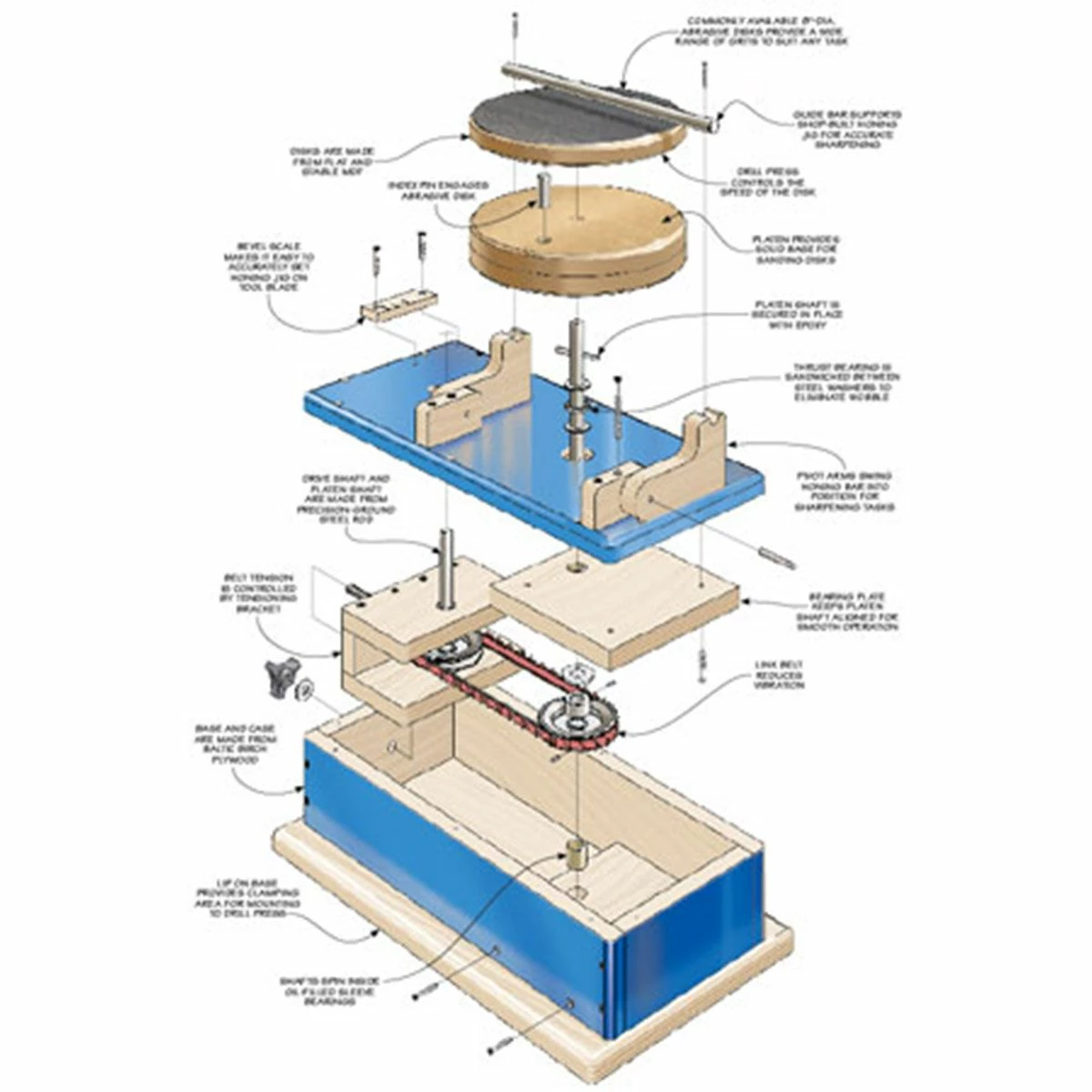 Step-by-step instructions, exploded views, materials list, and more—these plans have everything you need to build your own Drill Press Sharpening Station.
