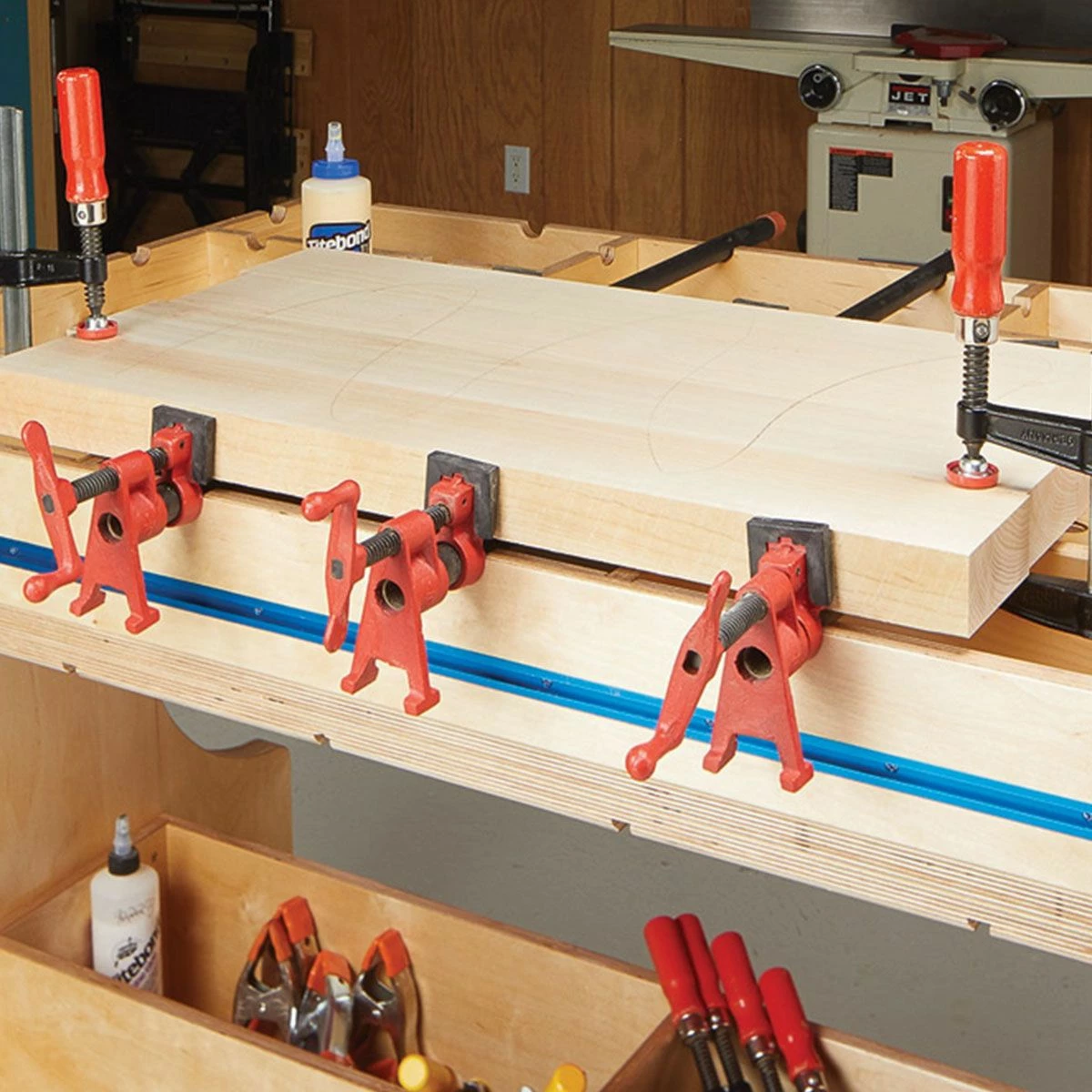 This clamping station is a great multitasker. One side of the top hosts an array of hold-downs. The other supports your pipe clamps.