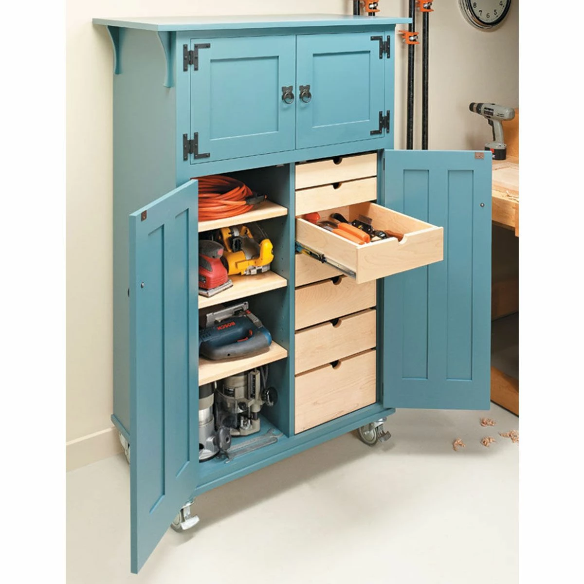 Organize and store your power and hand tools in style with this classic cabinet design.