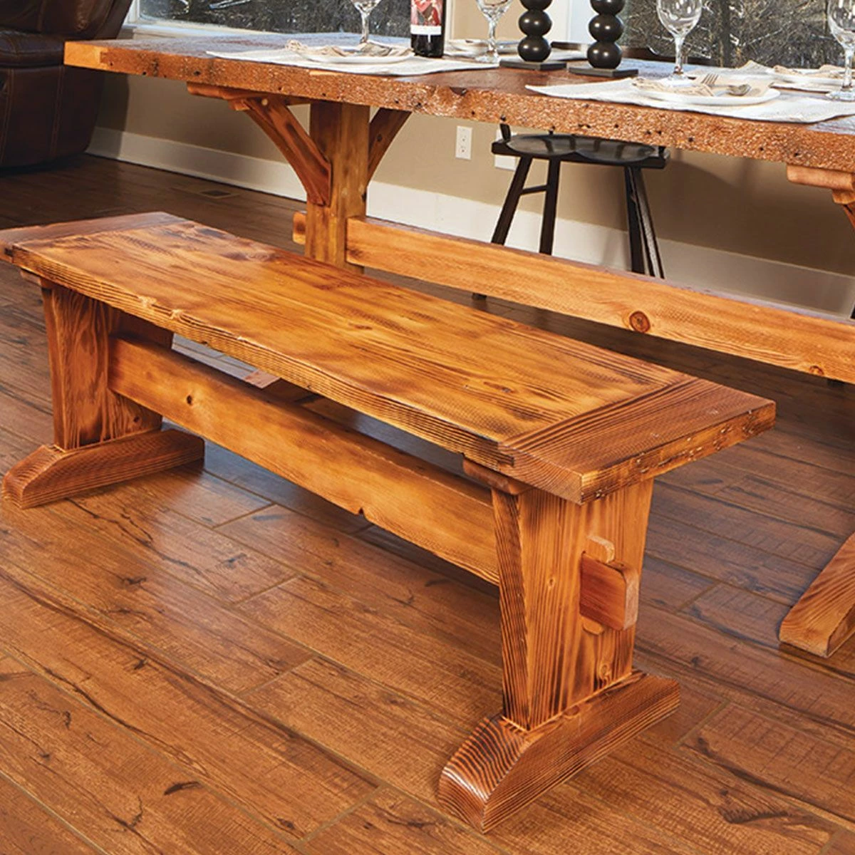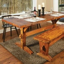 Reclaimed lumber and timber-frame design elements give this table and matching bench loads of farmhouse charm. It’s sure to be a hit in any home.