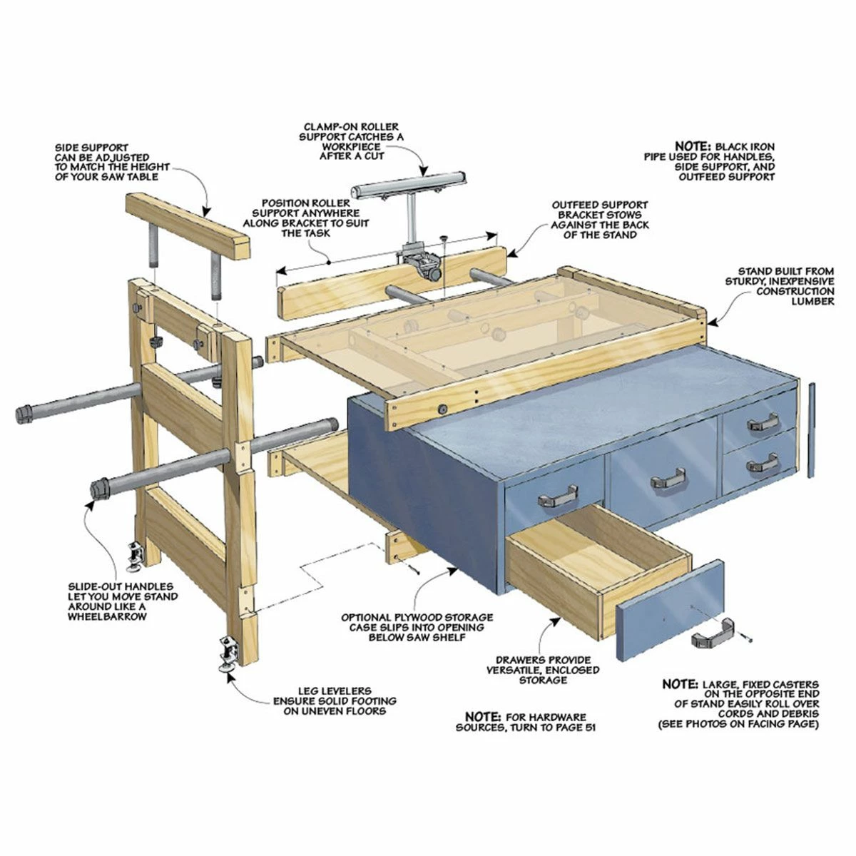 Step-by-step instructions, exploded views, materials list, and more—these plans have everything you need to build your own handy Table Saw Stand.