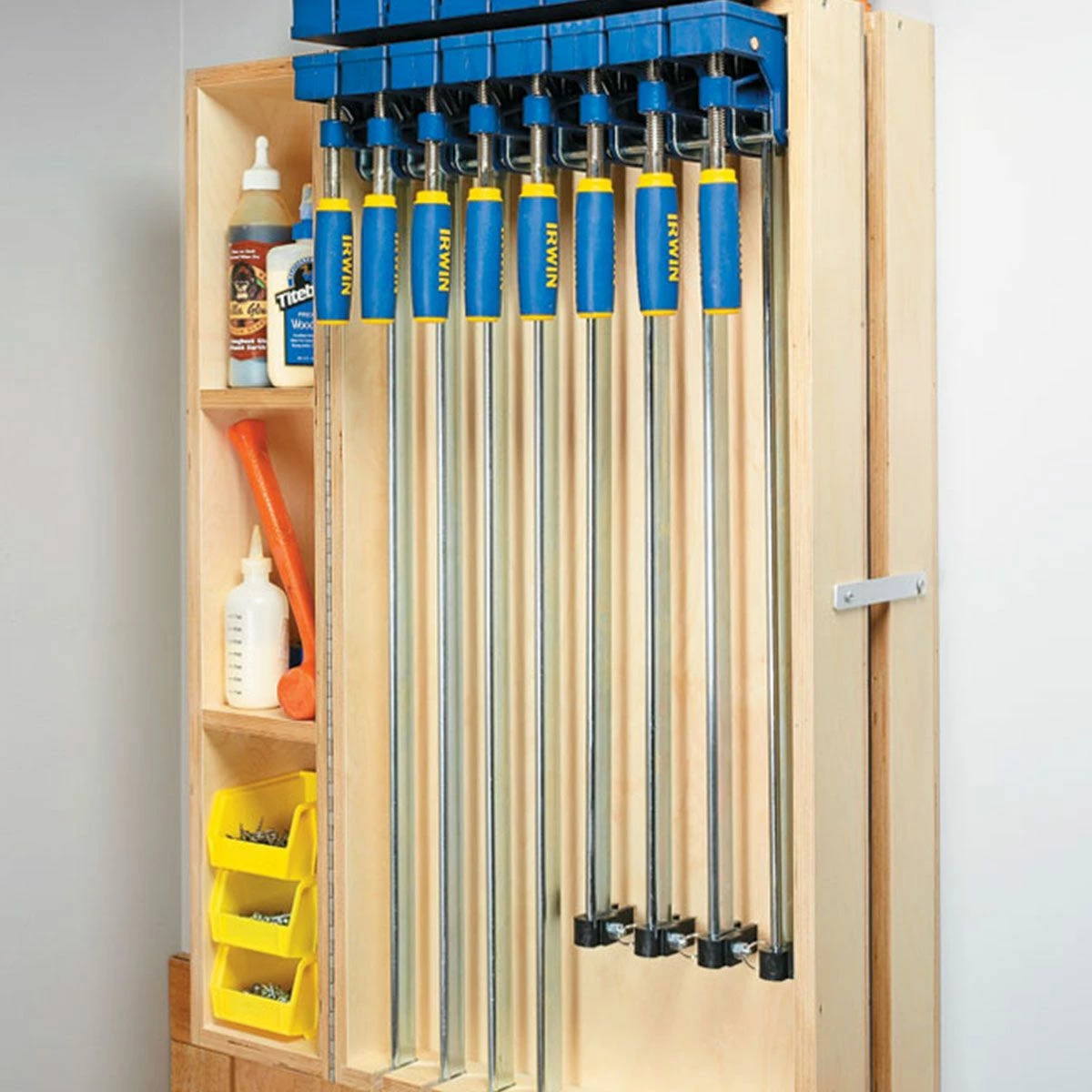 Get high-capacity clamp storage in a compact space with this multi-layer wall rack, plus cubbies for clamping accessories.