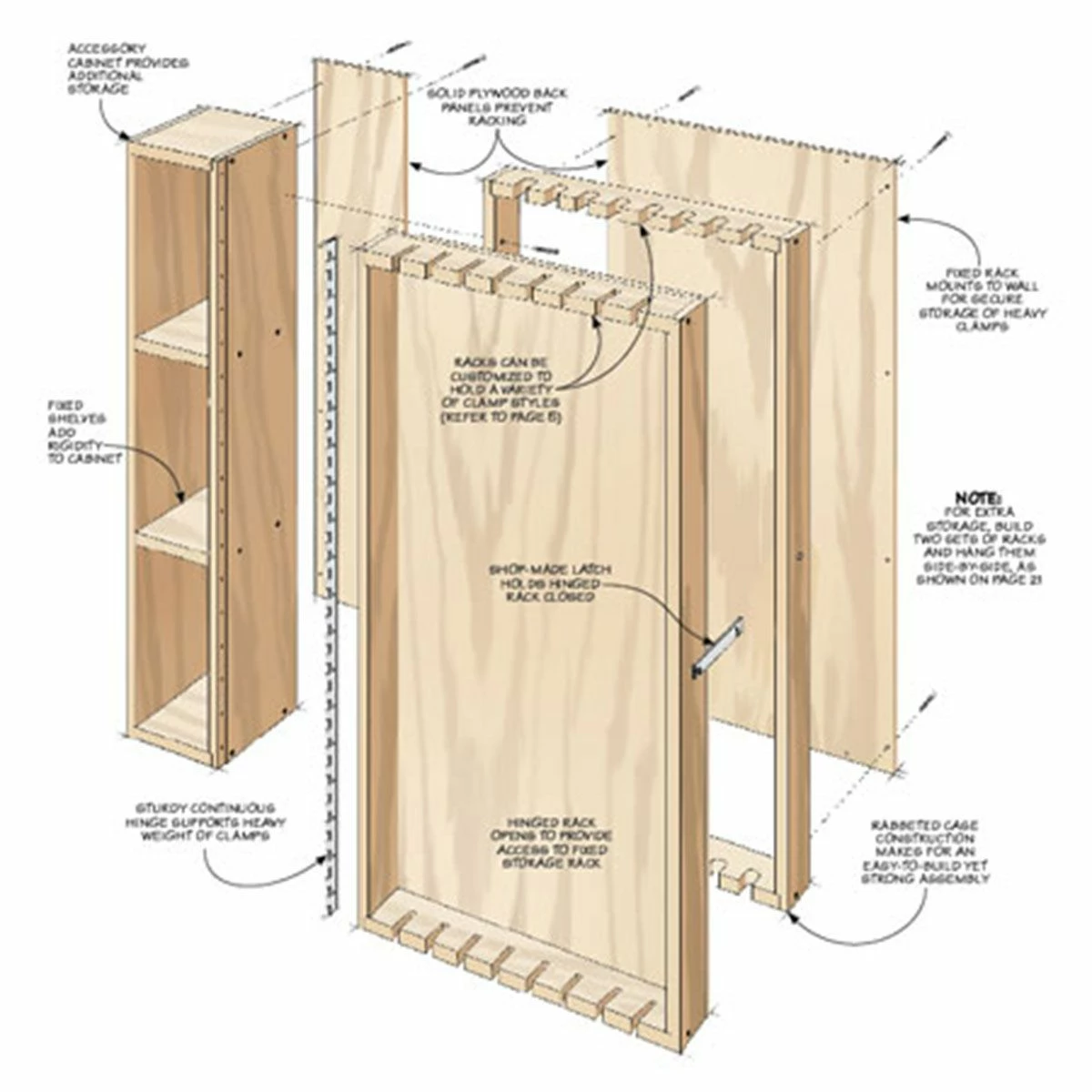 Step-by-step instructions, exploded views, materials list, and more—these plans have everything you need to build your own Wall-Mounted Clamp Rack.