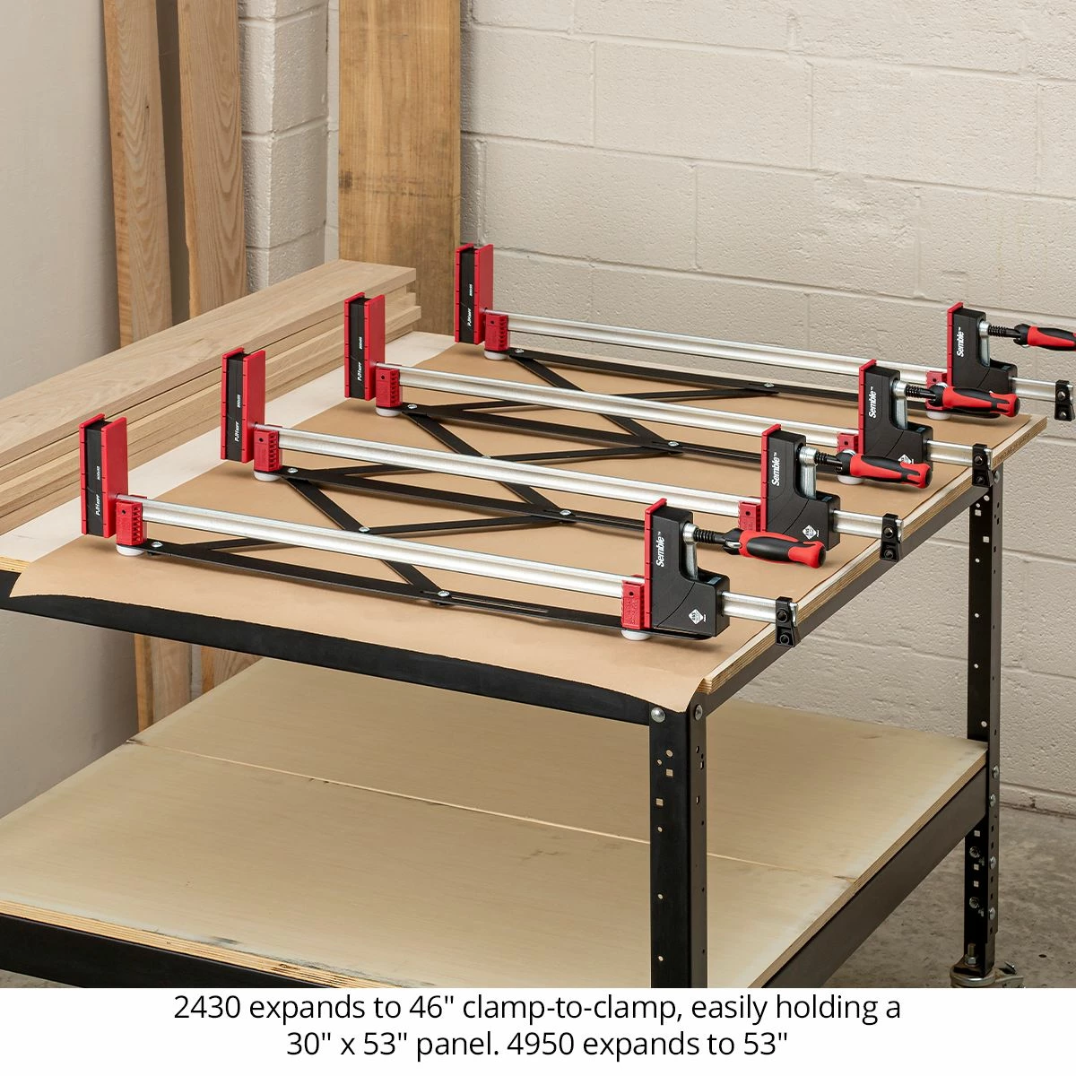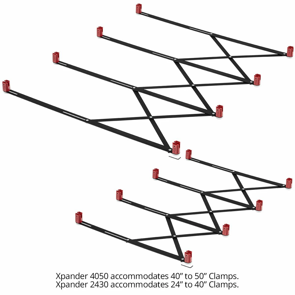 The larger 4050 Xpander accommodates 40″ to 50″ clamps. The smaller 2430 Xpander handles 24″ to 40″ clamps. The 4050 expands to 53″ from edge to edge, allowing you to glue up panels up to 60″ long. The 2430 expands to 46″ edge to edge, letting you glue up panels 53″ long.